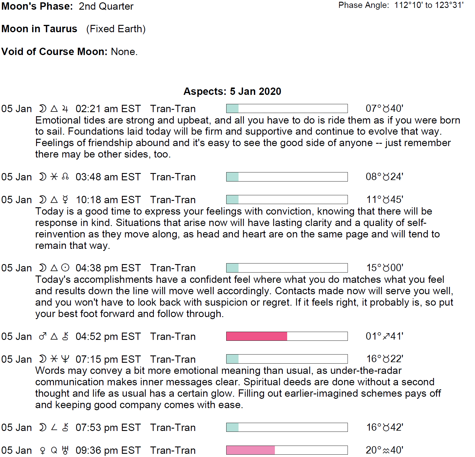 Planet Color Key: The longer the bar, the slower the aspecting planet and the longer the duration of the planet’s transit.