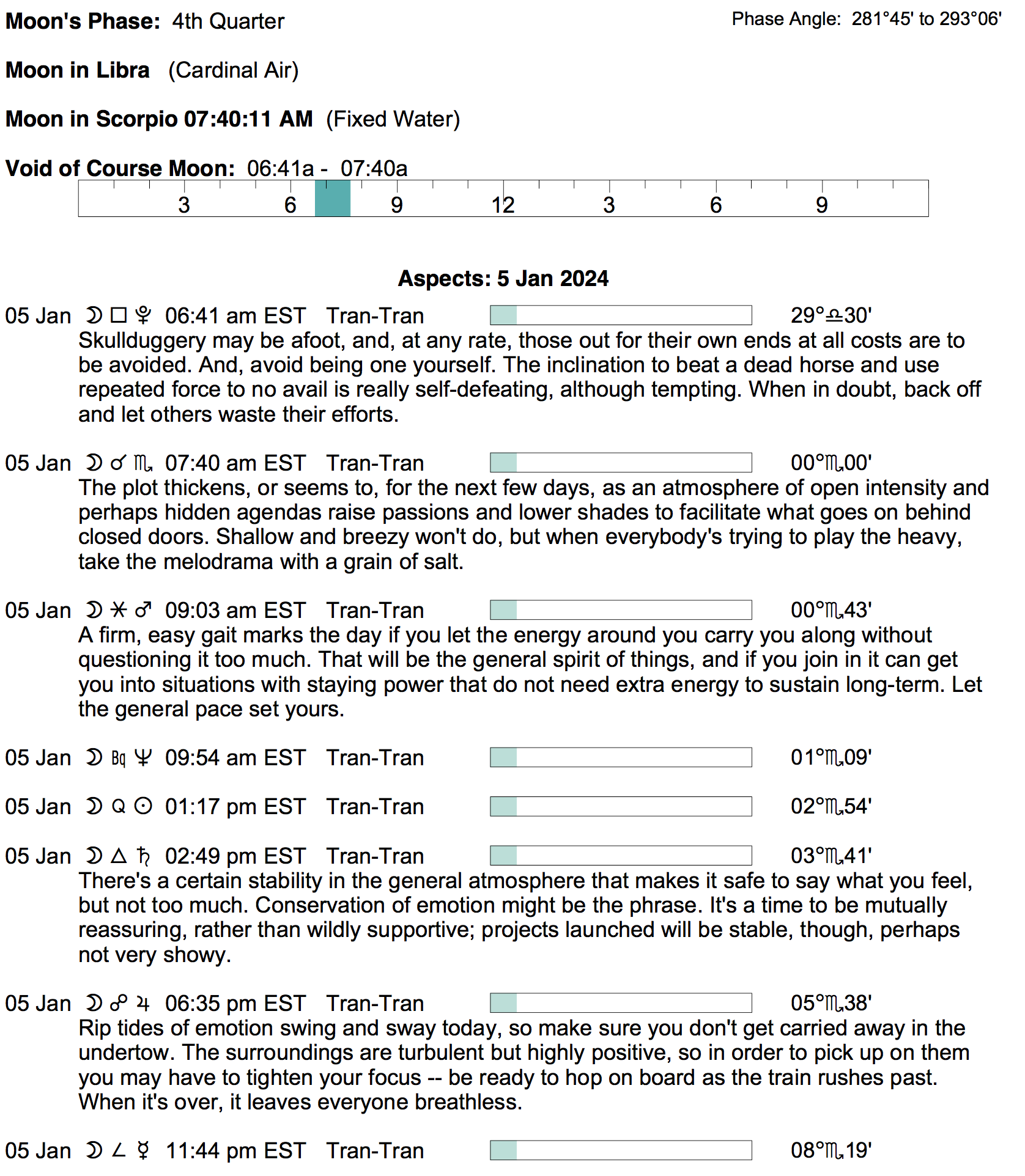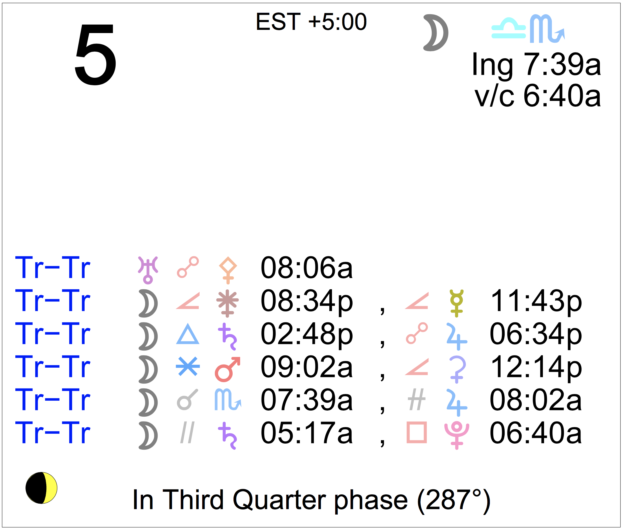 - A void Moon period occurs from 6:40 AM to 7:39 AM today.