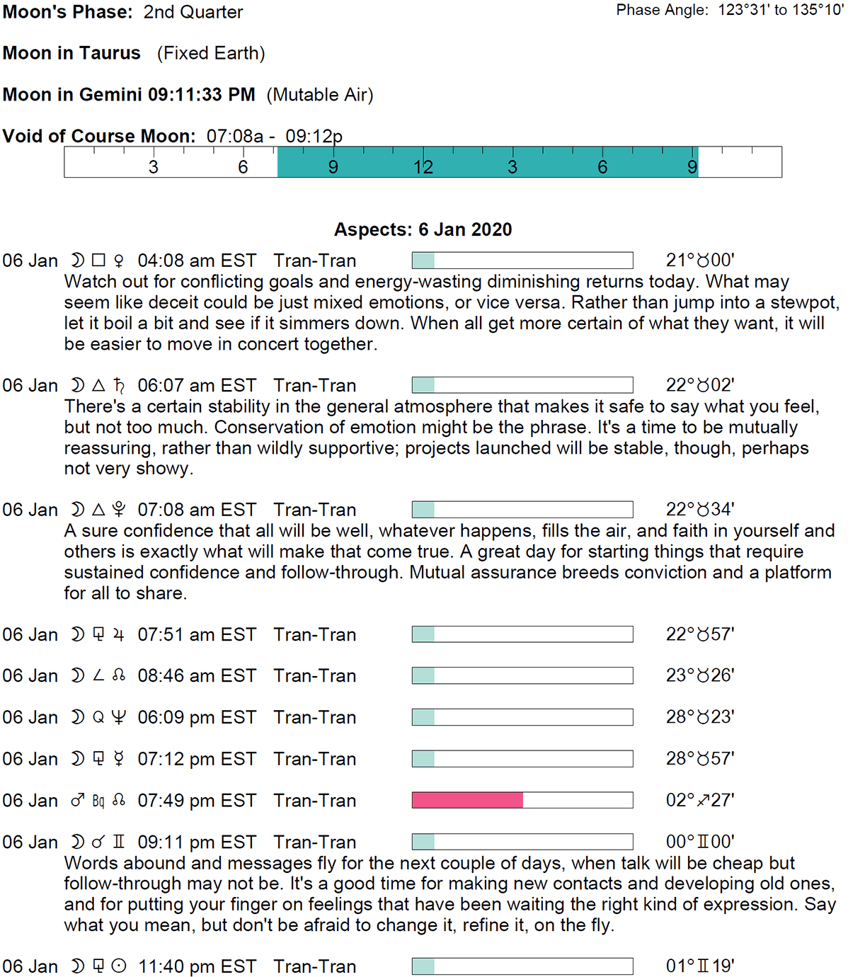 Planet Color Key: The longer the bar, the slower the aspecting planet and the longer the duration of the planet’s transit.
