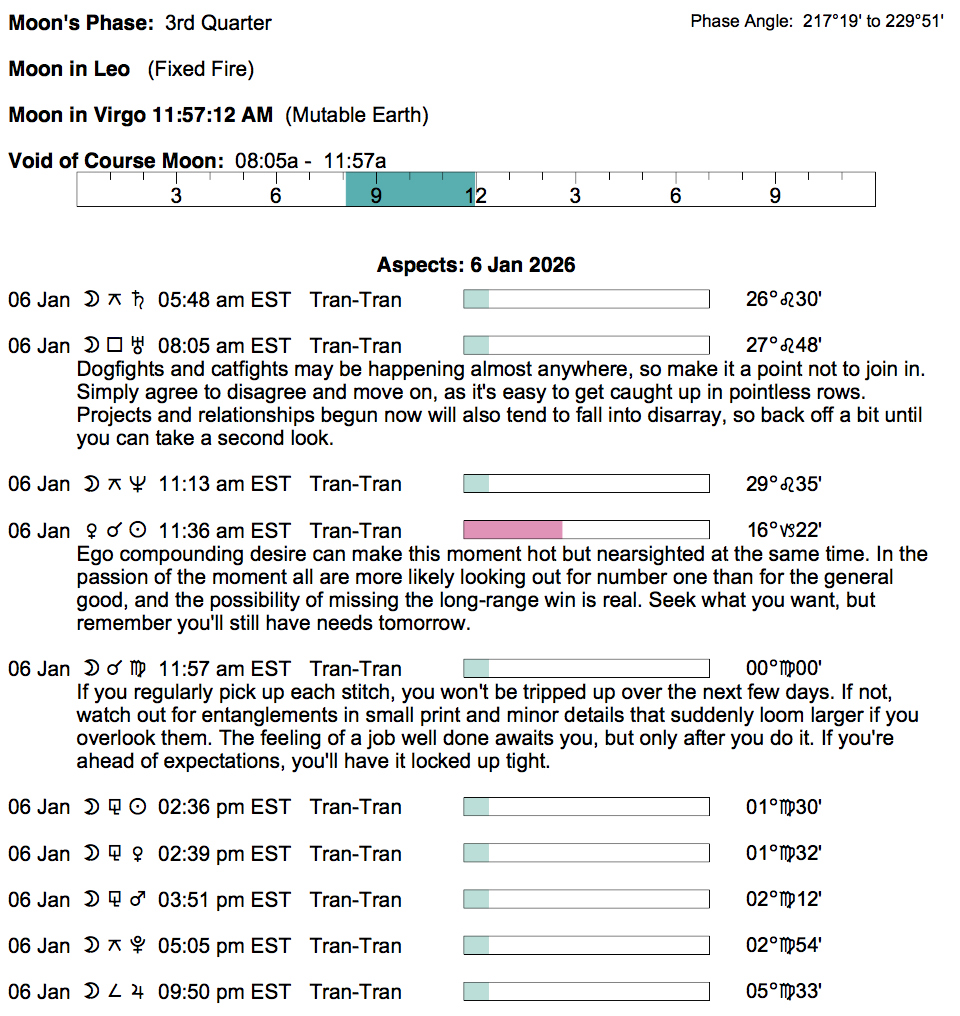 - A void Moon period occurs from 8:04 AM to 11:56 AM today.