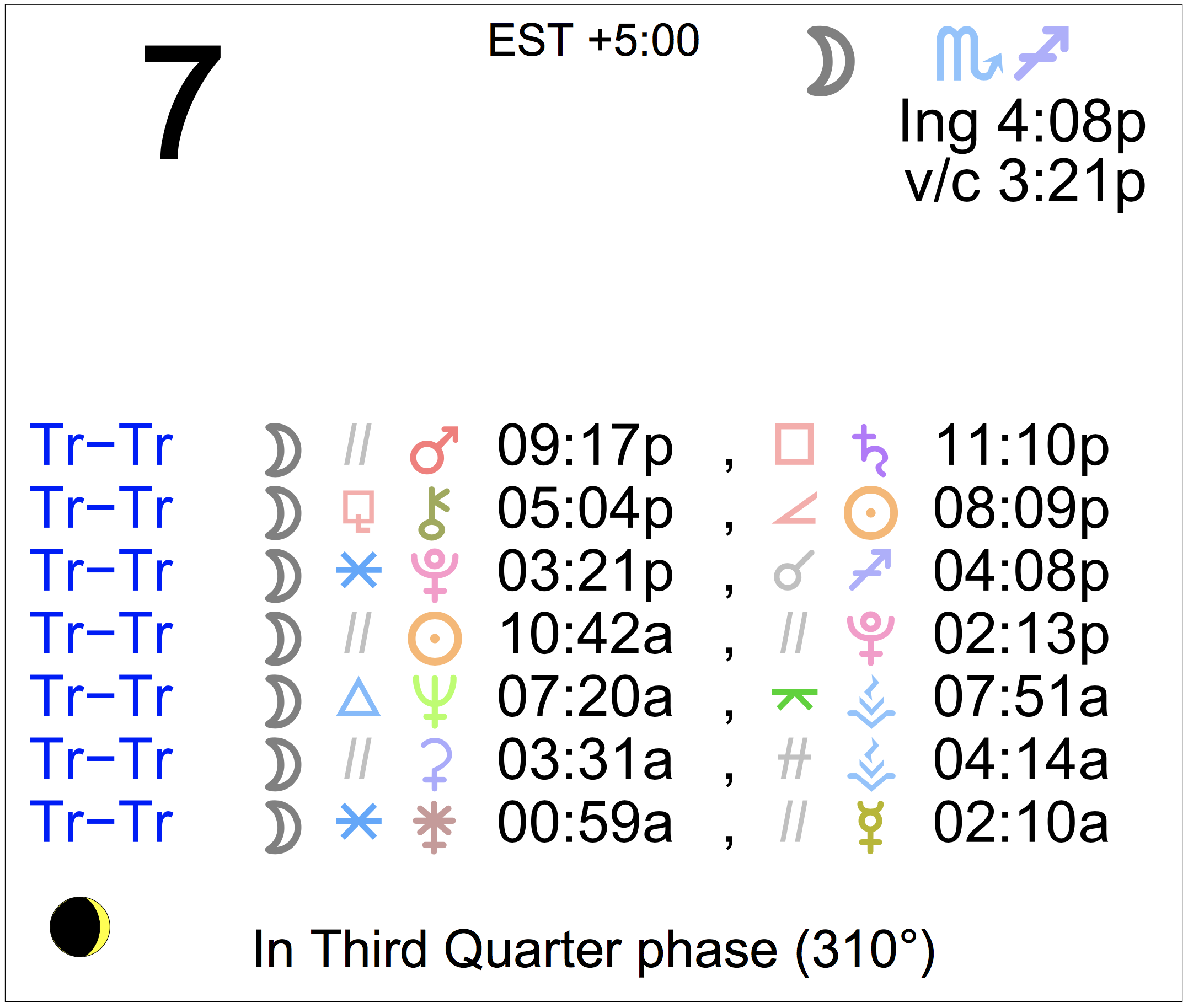 Planet Color Key: The longer the bar, the slower the aspecting planet, and the longer the duration of the planet’s transit.