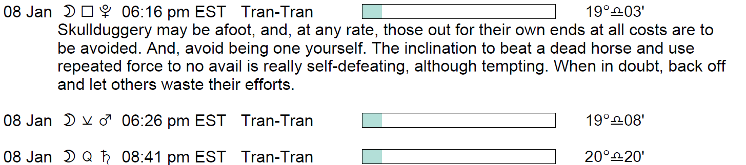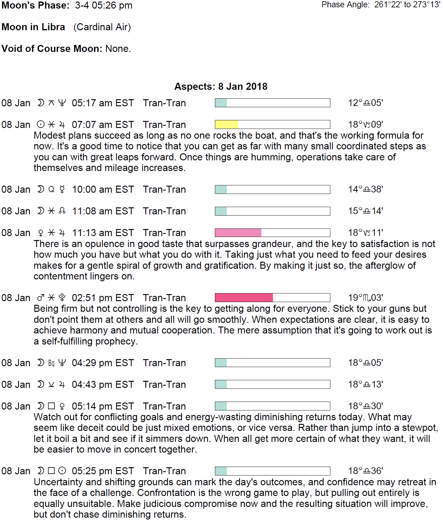 Planet Color Key: The longer the bar, the slower the aspecting planet and the longer the duration of the planet’s transit.