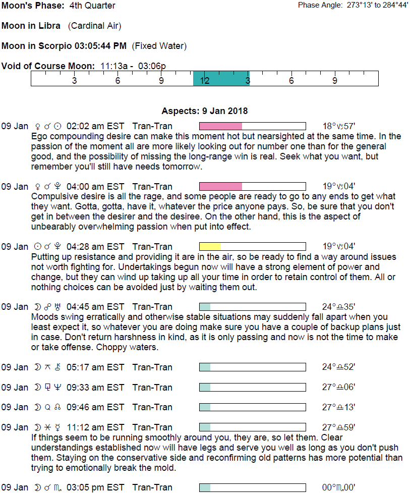 Planet Color Key: The longer the bar, the slower the aspecting planet and the longer the duration of the planet’s transit.