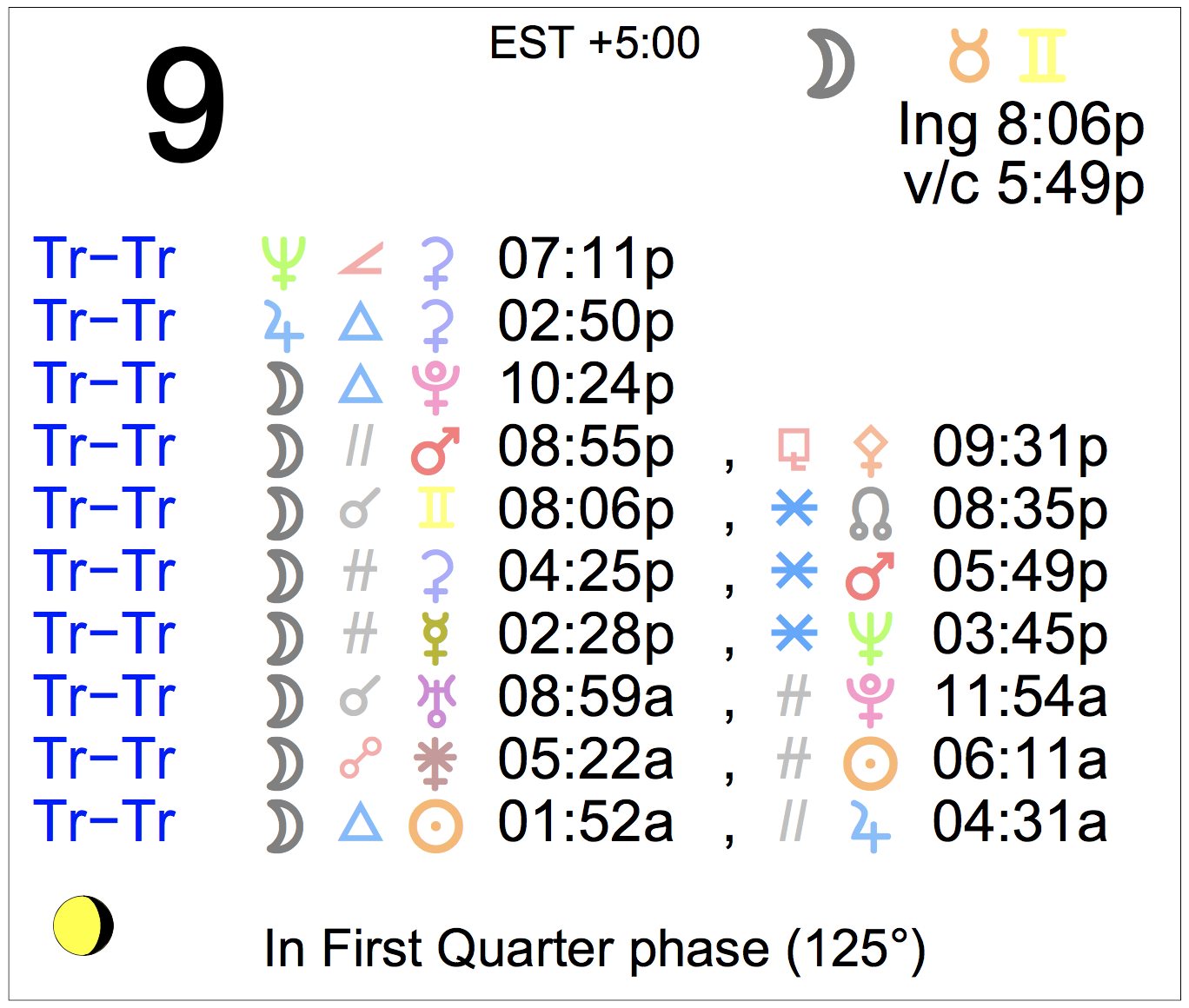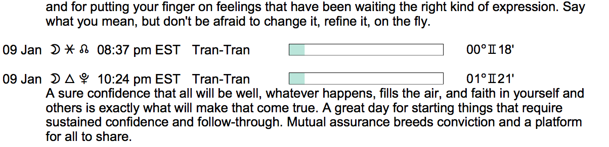 Planet Color Key: The longer the bar, the slower the aspecting planet, and the longer the duration of the planet’s transit.