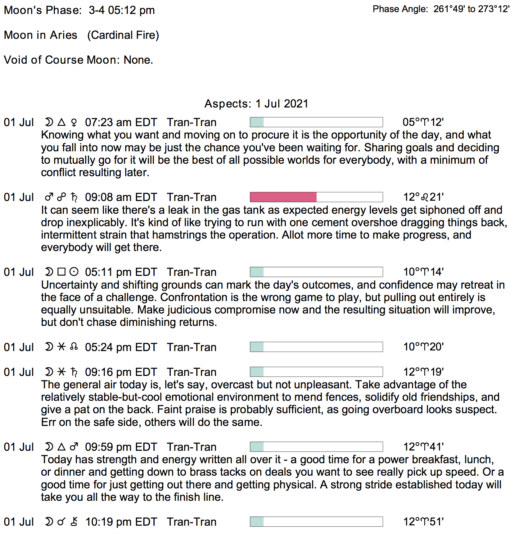 Planet Color Key: The longer the bar, the slower the aspecting planet, and the longer the duration of the planet’s transit.