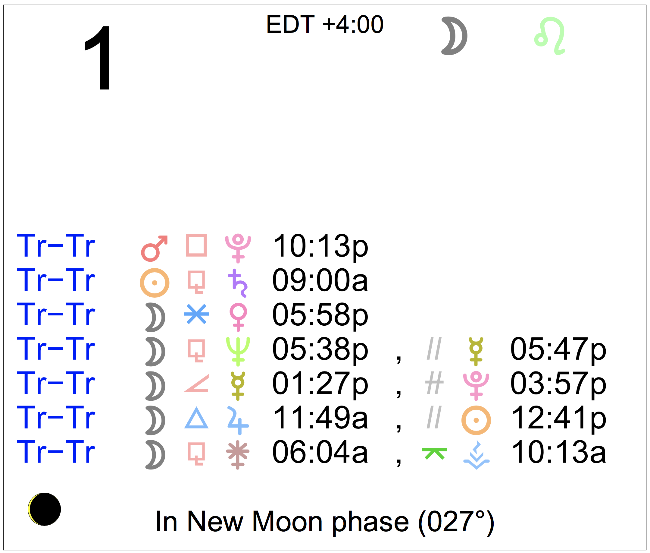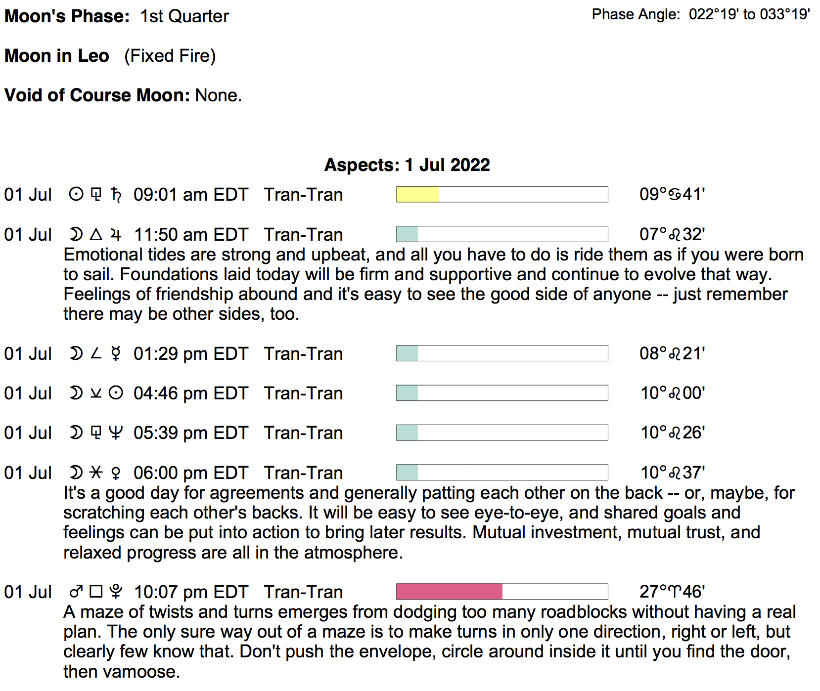 Planet Color Key: The longer the bar, the slower the aspecting planet, and the longer the duration of the planet’s transit.