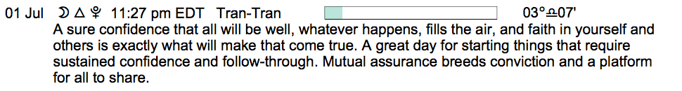 Planet Color Key: The longer the bar, the slower the aspecting planet, and the longer the duration of the planet’s transit.