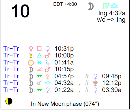 The following aspects (major only) and positions are at noon (EDT) on July 10th: