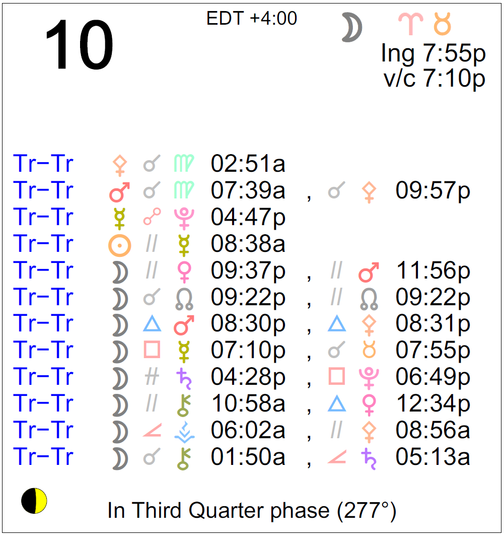 - The Last Quarter Moon occurred yesterday, and the New Moon will occur in Cancer on the 17th.