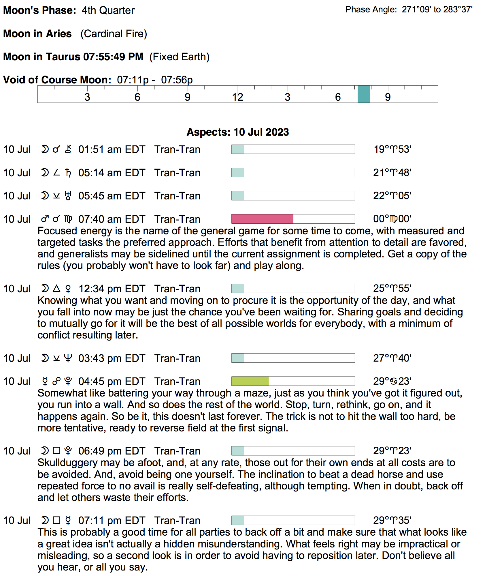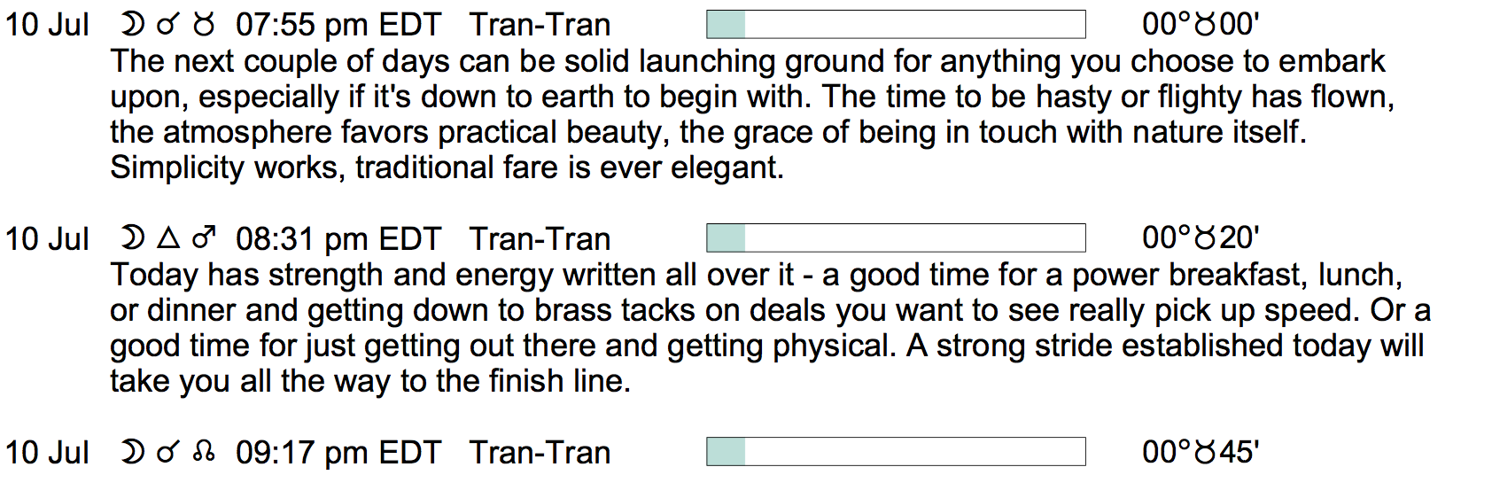 Planet Color Key: The longer the bar, the slower the aspecting planet, and the longer the duration of the planet’s transit.
