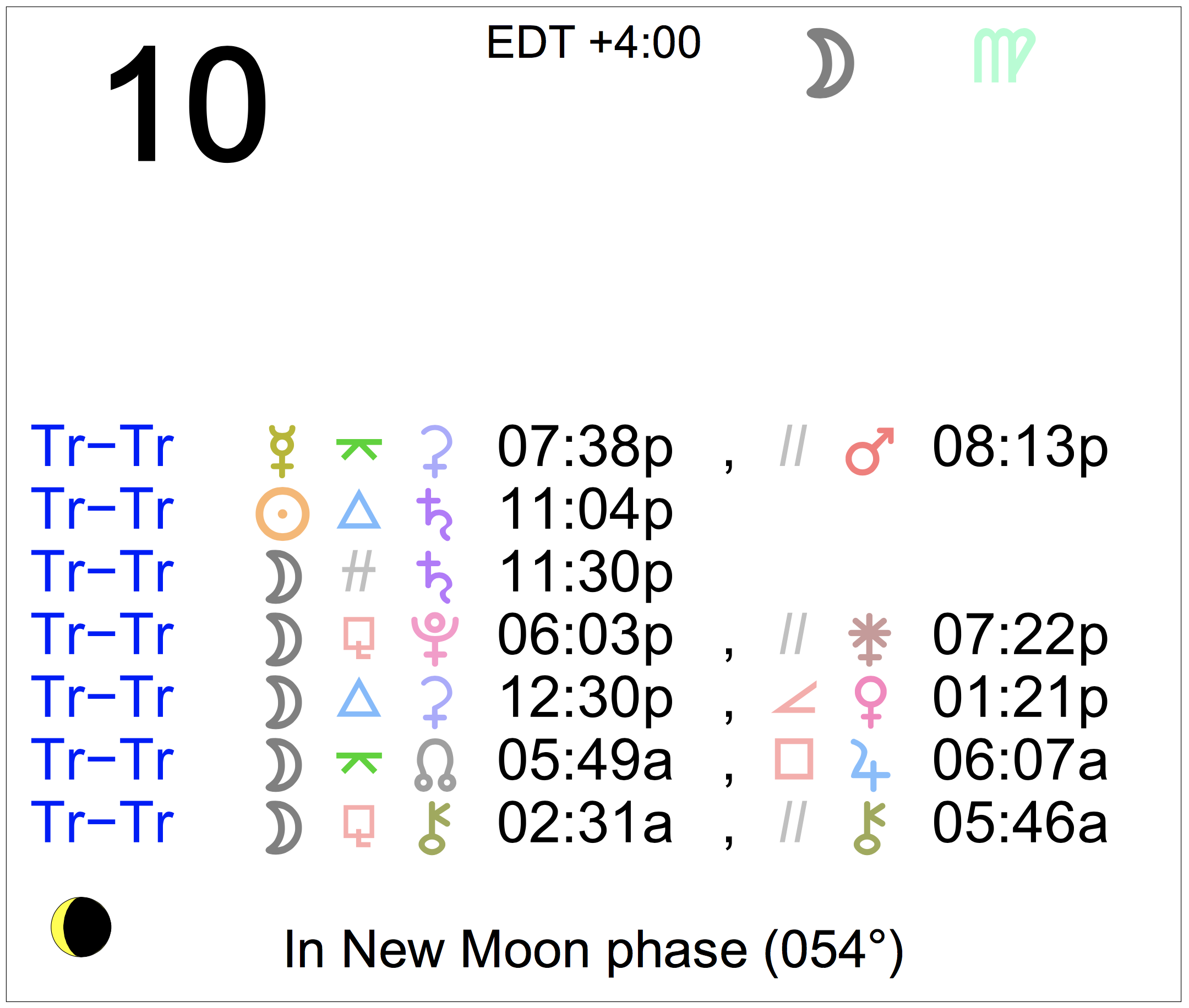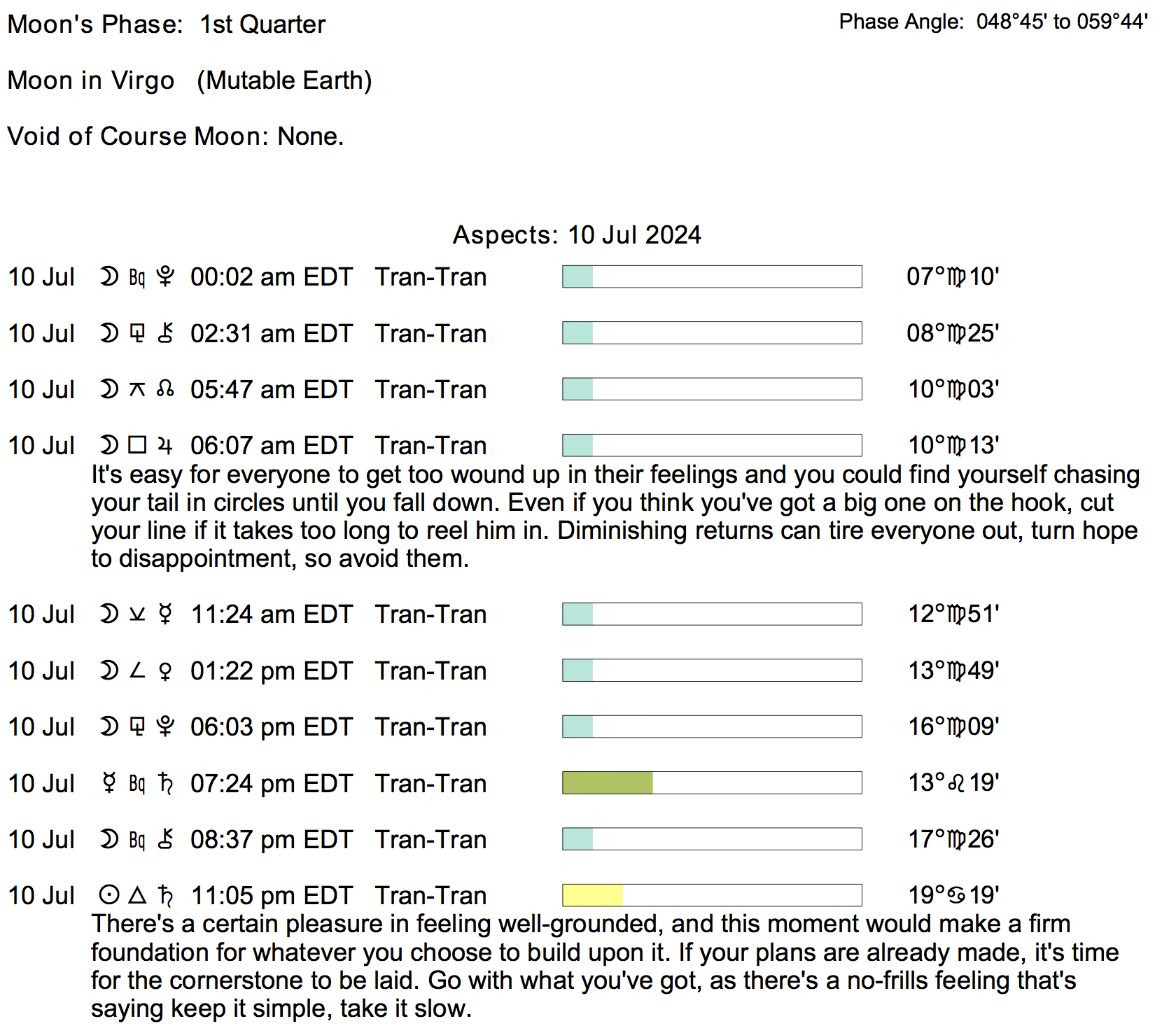 Planet Color Key: The longer the bar, the slower the aspecting planet, and the longer the duration of the planet’s transit.