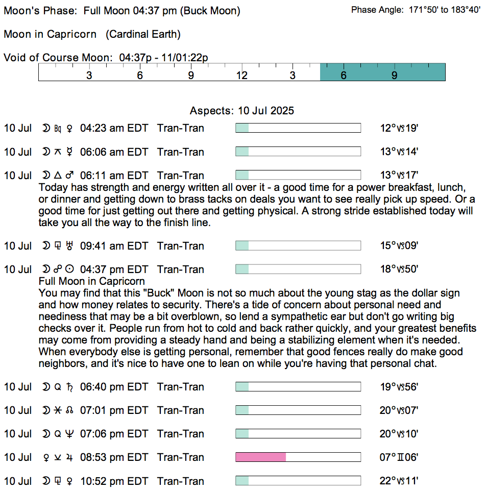 Planet Color Key: The longer the bar, the slower the aspecting planet, and the longer the duration of the planet’s transit.