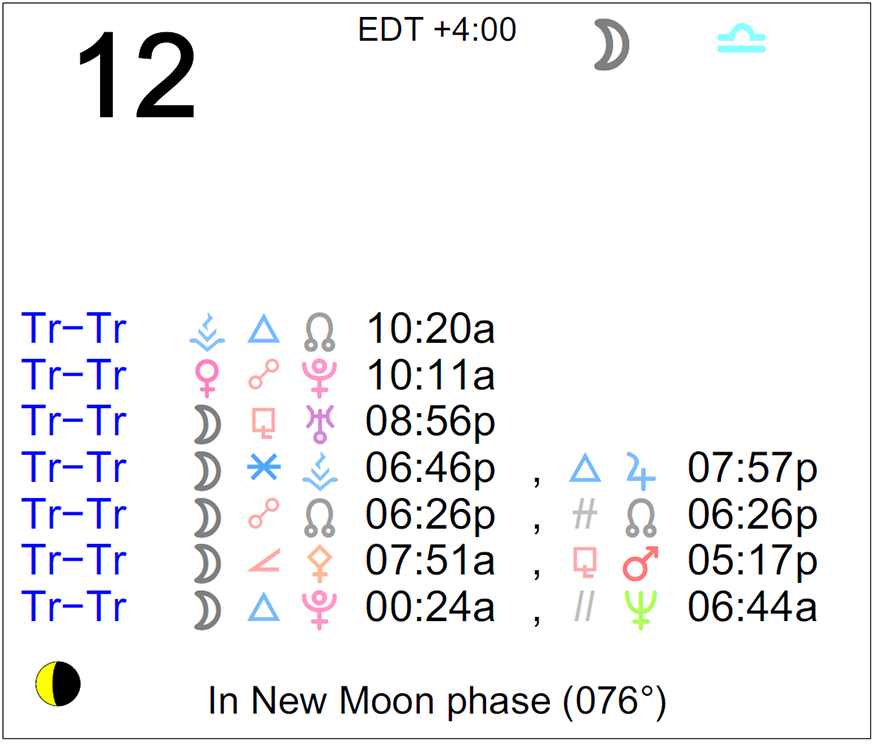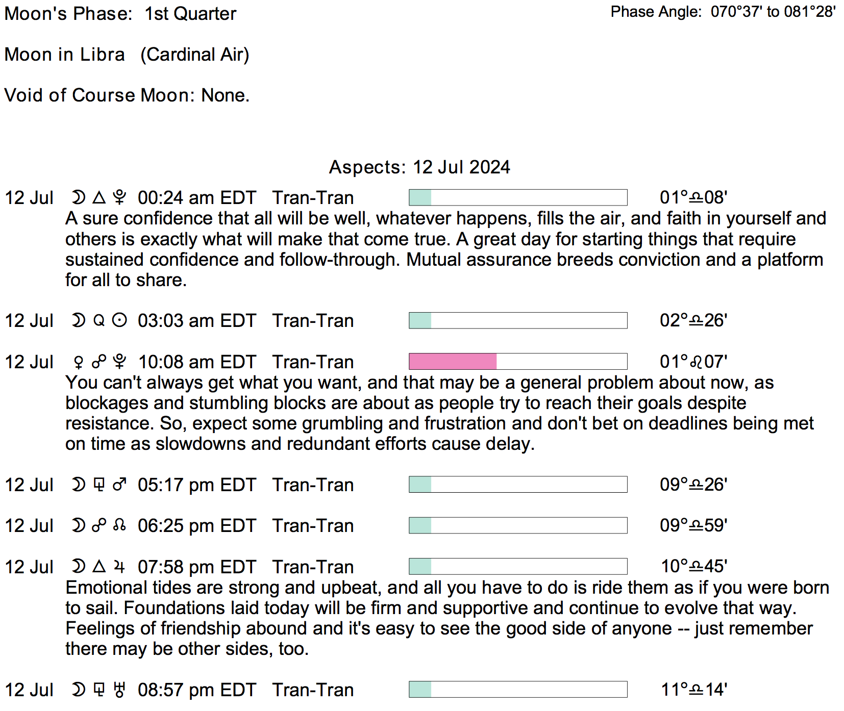Planet Color Key: The longer the bar, the slower the aspecting planet, and the longer the duration of the planet’s transit.