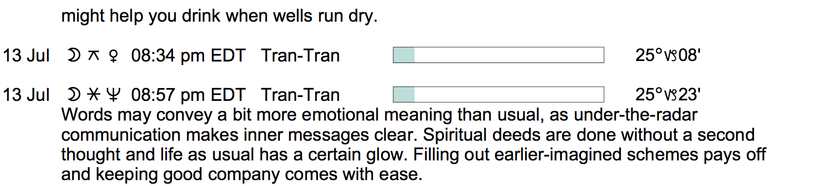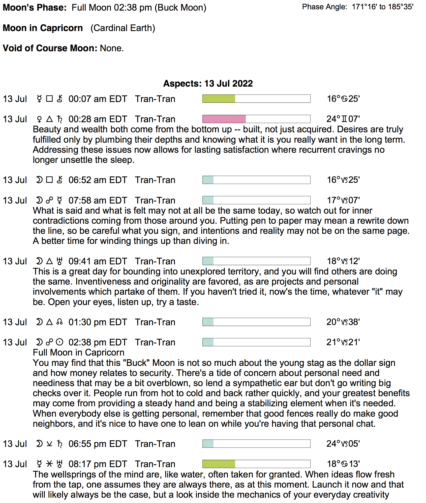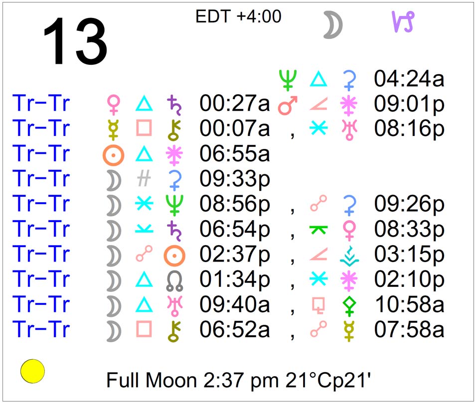 Planet Color Key: The longer the bar, the slower the aspecting planet, and the longer the duration of the planet’s transit.