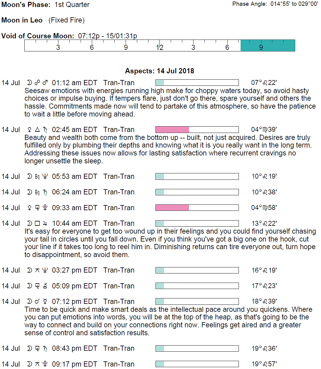 Planet Color Key: The longer the bar, the slower the aspecting planet and the longer the duration of the planet’s transit.