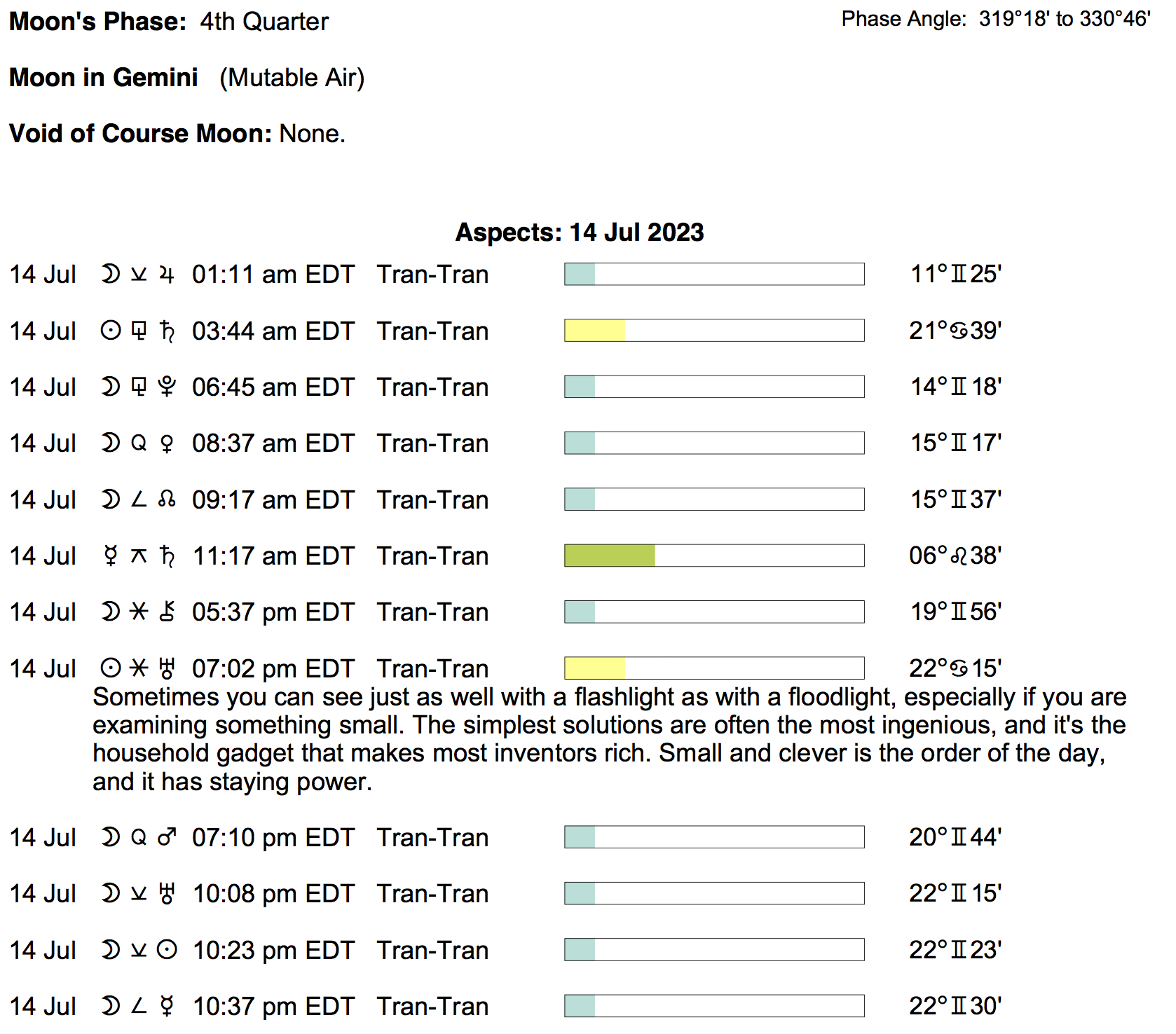 Planet Color Key: The longer the bar, the slower the aspecting planet, and the longer the duration of the planet’s transit.