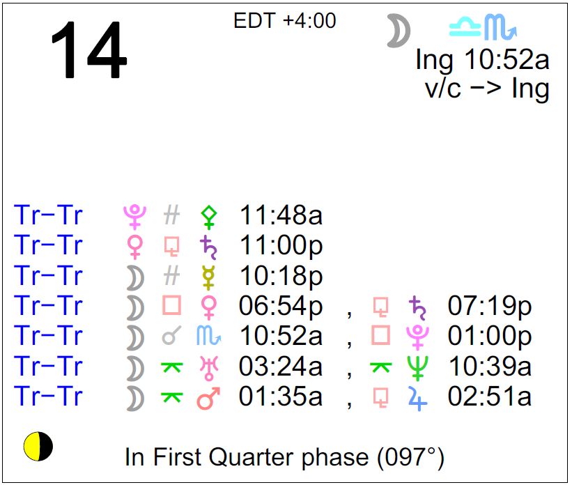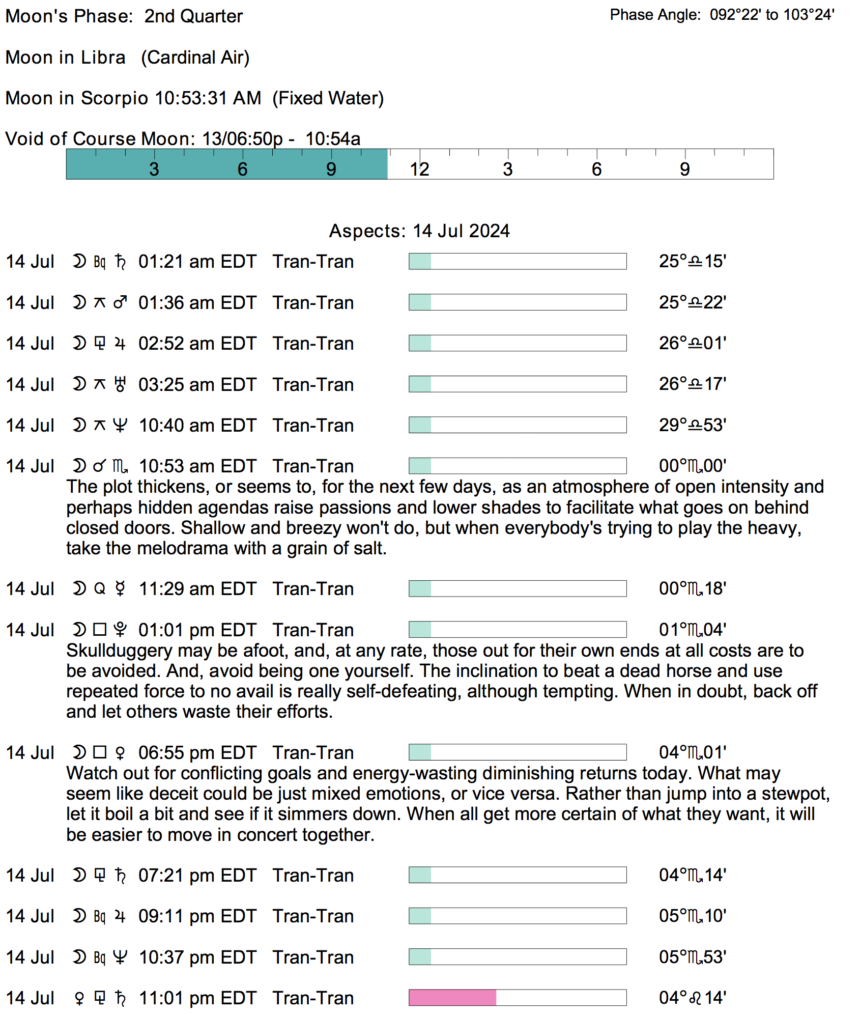 Planet Color Key: The longer the bar, the slower the aspecting planet, and the longer the duration of the planet’s transit.