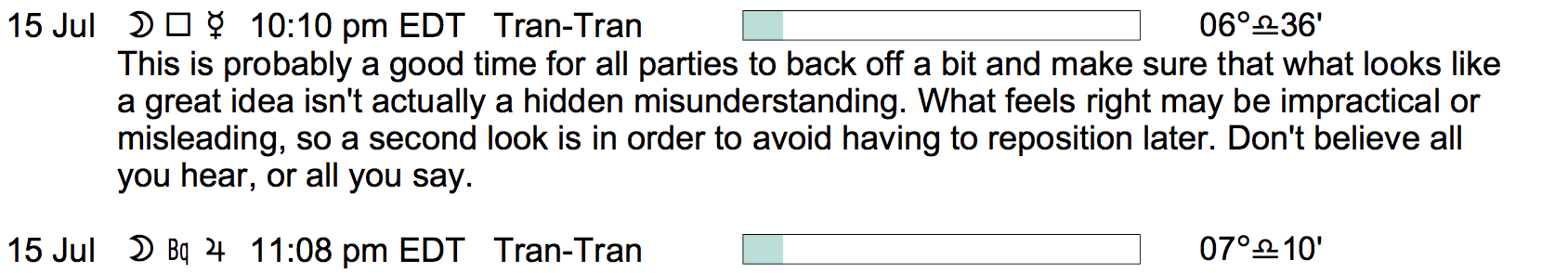 Planet Color Key: The longer the bar, the slower the aspecting planet, and the longer the duration of the planet’s transit.