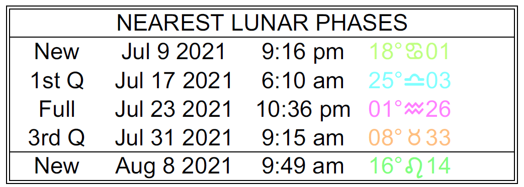- The New Moon occurred on the 9th in the sign of Cancer, and the First Quarter Moon will happen on the 17th.
