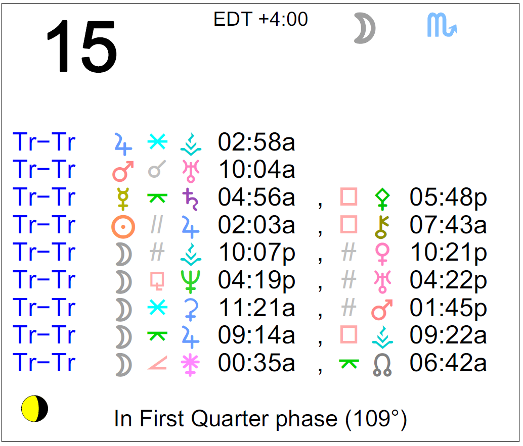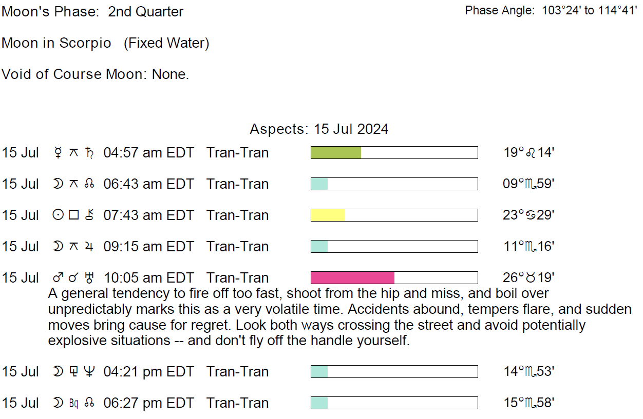 Planet Color Key: The longer the bar, the slower the aspecting planet, and the longer the duration of the planet’s transit.