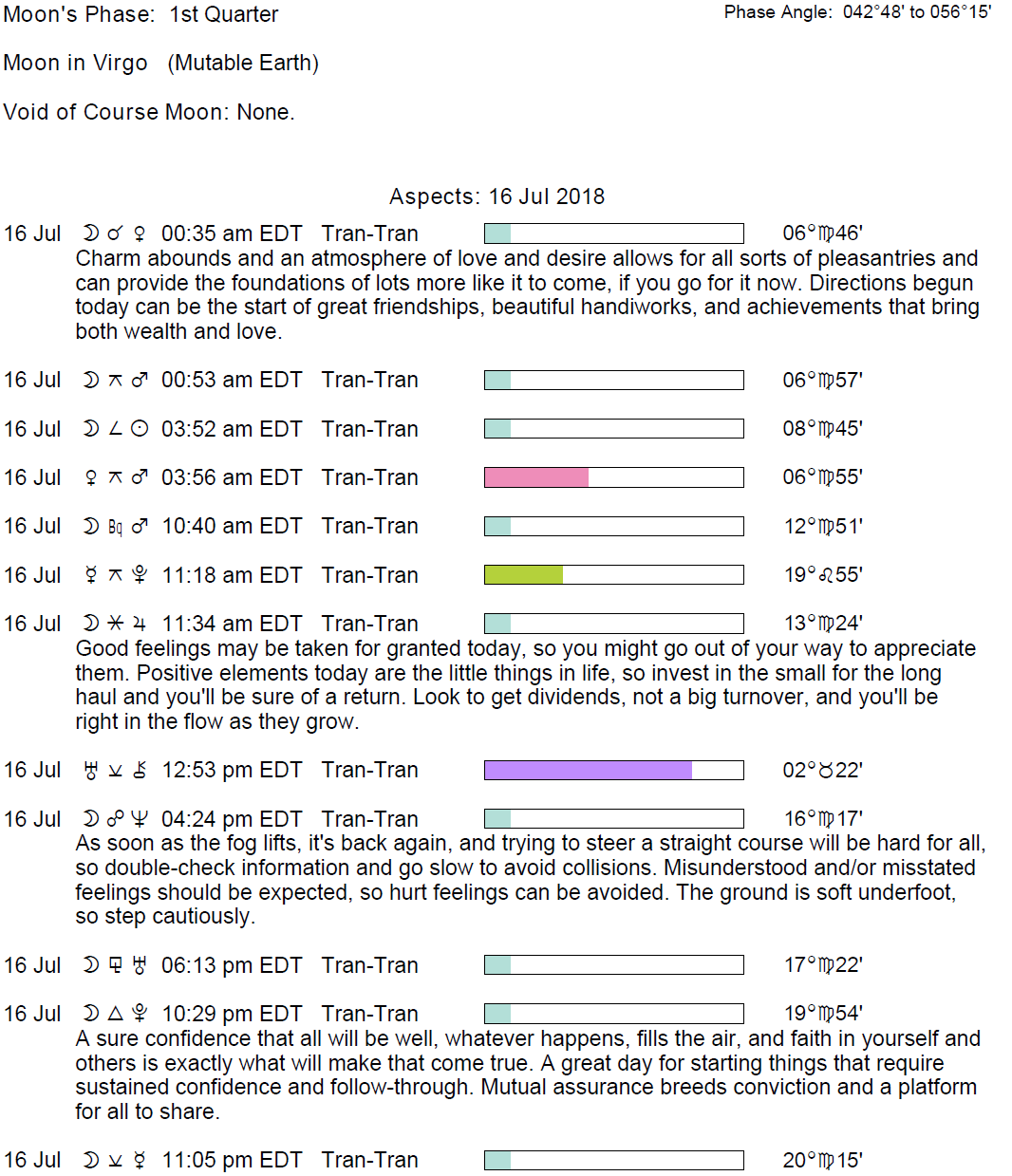 Planet Color Key: The longer the bar, the slower the aspecting planet and the longer the duration of the planet’s transit.