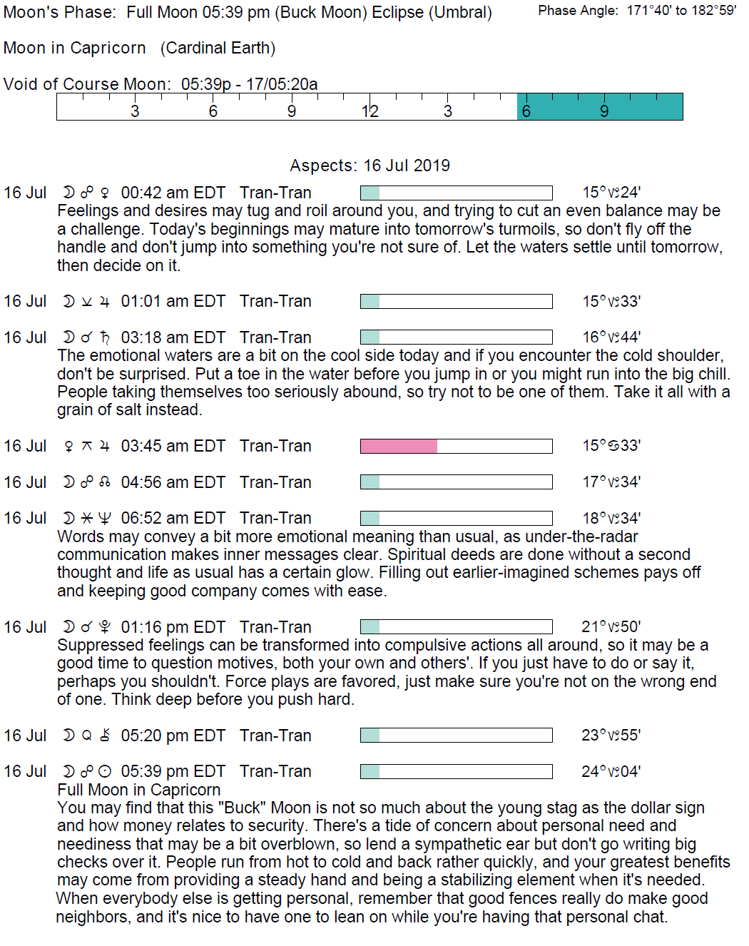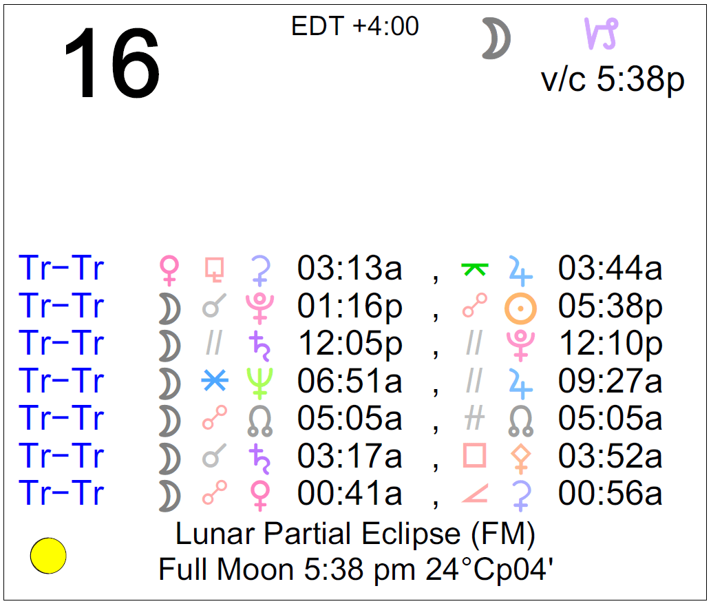 - The Full Moon (a Lunar Eclipse) occurs today at 5:38 PM in the sign of Capricorn.