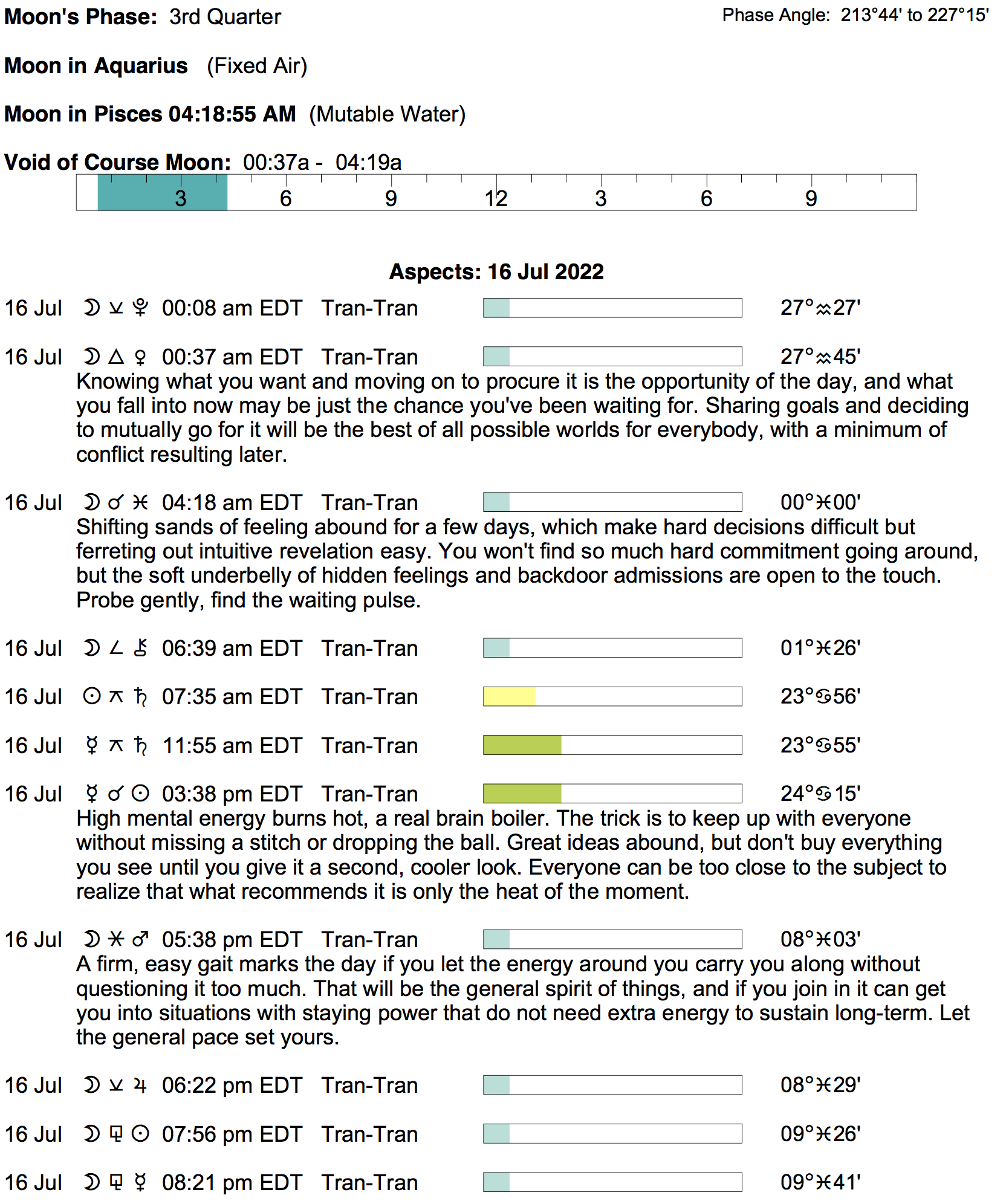 Planet Color Key: The longer the bar, the slower the aspecting planet, and the longer the duration of the planet’s transit.