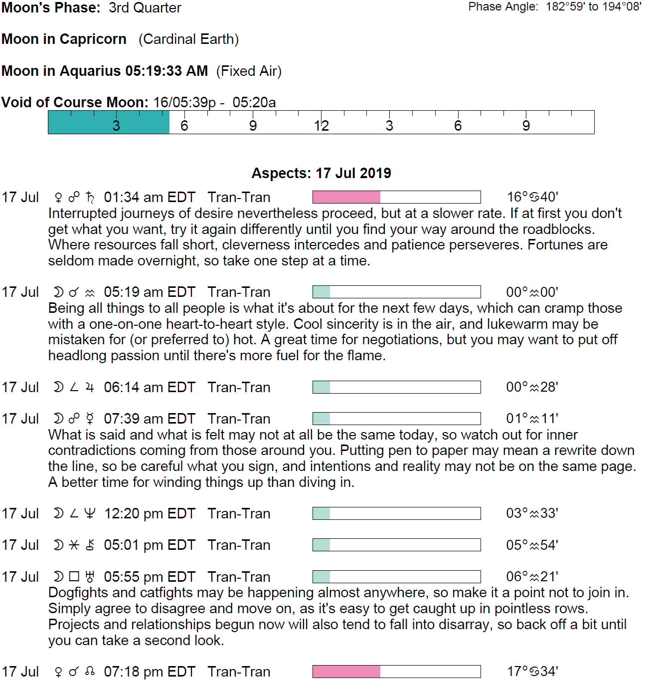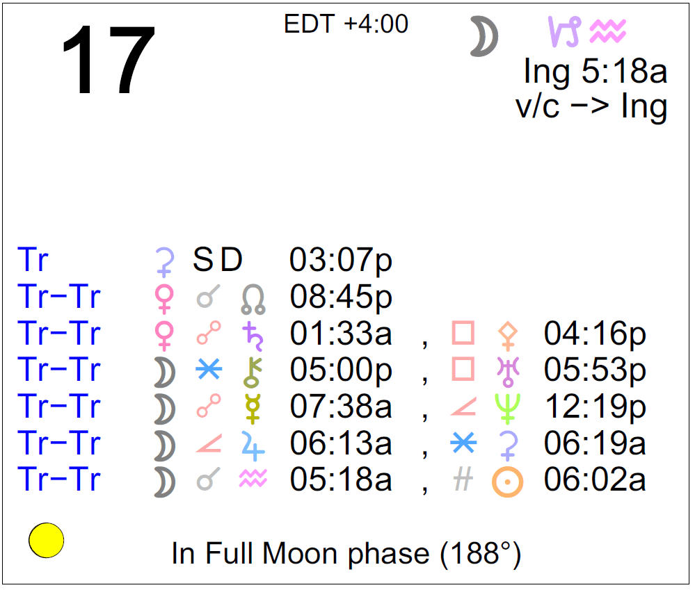 Planet Color Key: The longer the bar, the slower the aspecting planet and the longer the duration of the planet’s transit.