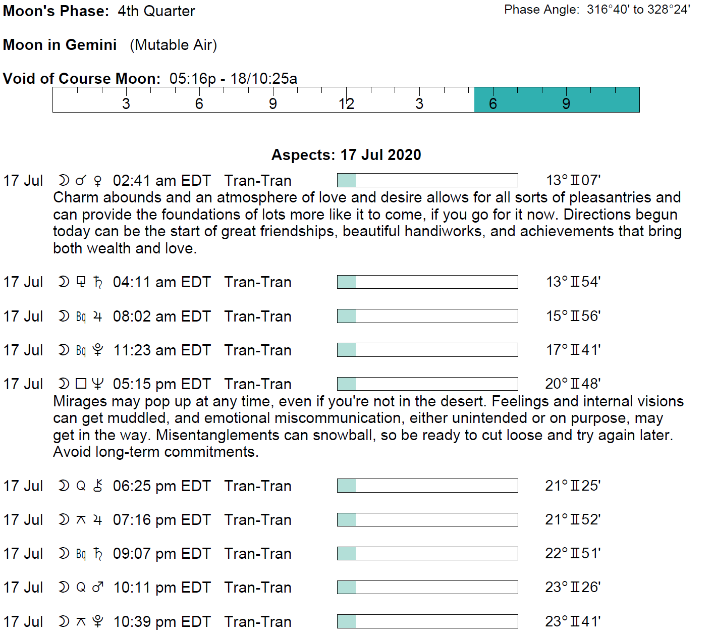 Planet Color Key: The longer the bar, the slower the aspecting planet and the longer the duration of the planet’s transit.