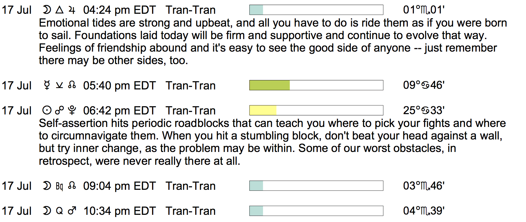 Planet Color Key: The longer the bar, the slower the aspecting planet, and the longer the duration of the planet’s transit.