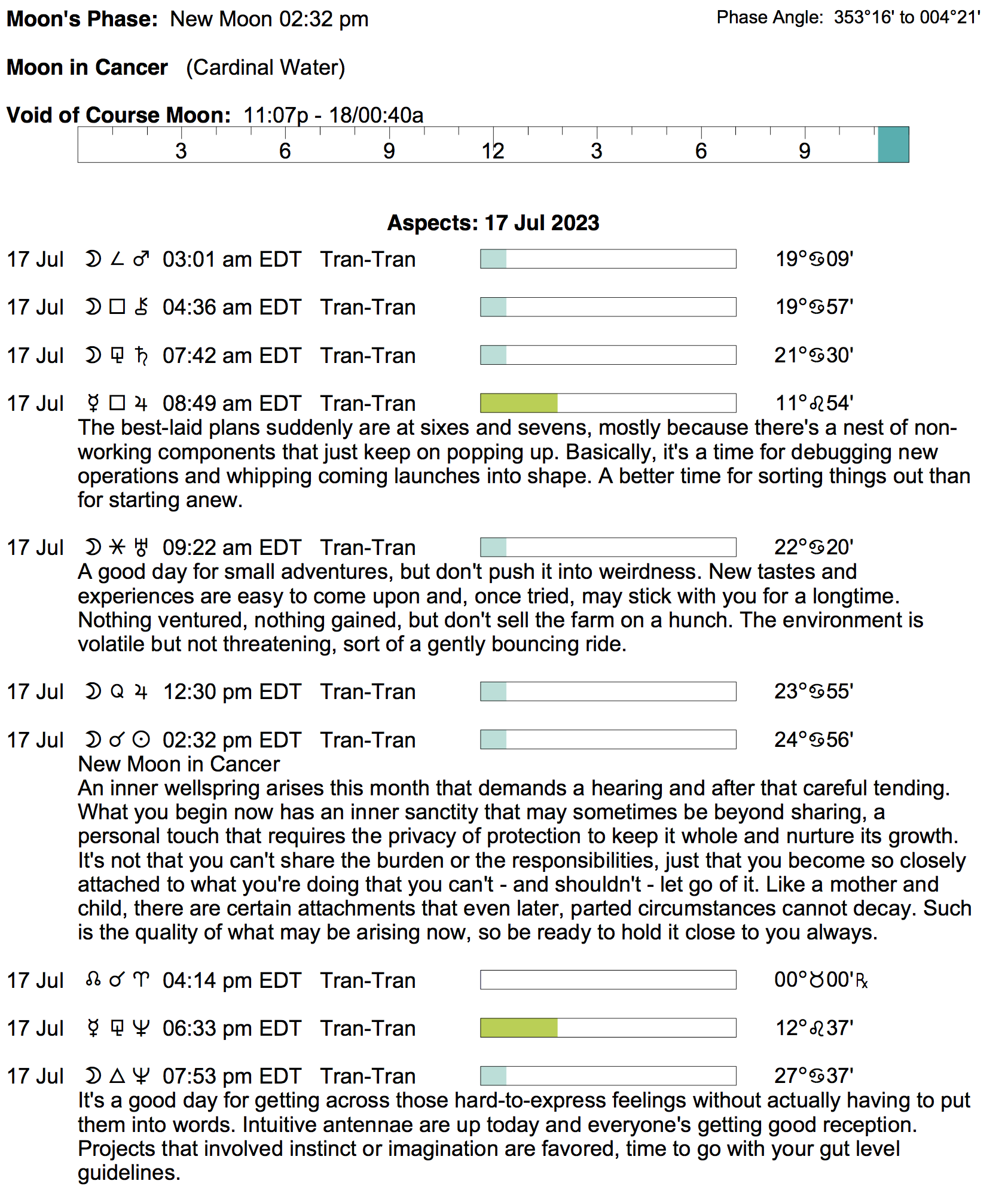 - The New Moon occurs today in Cancer at 2:31 PM.