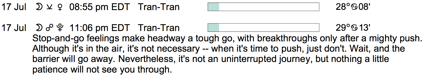 Planet Color Key: The longer the bar, the slower the aspecting planet, and the longer the duration of the planet’s transit.