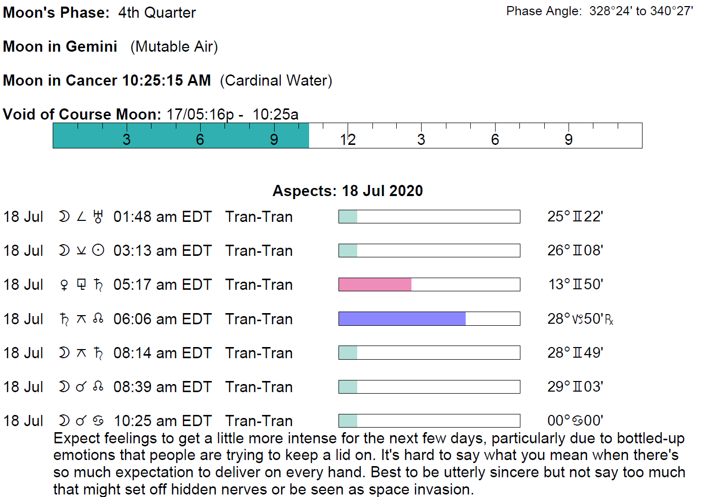 Planet Color Key: The longer the bar, the slower the aspecting planet and the longer the duration of the planet’s transit.