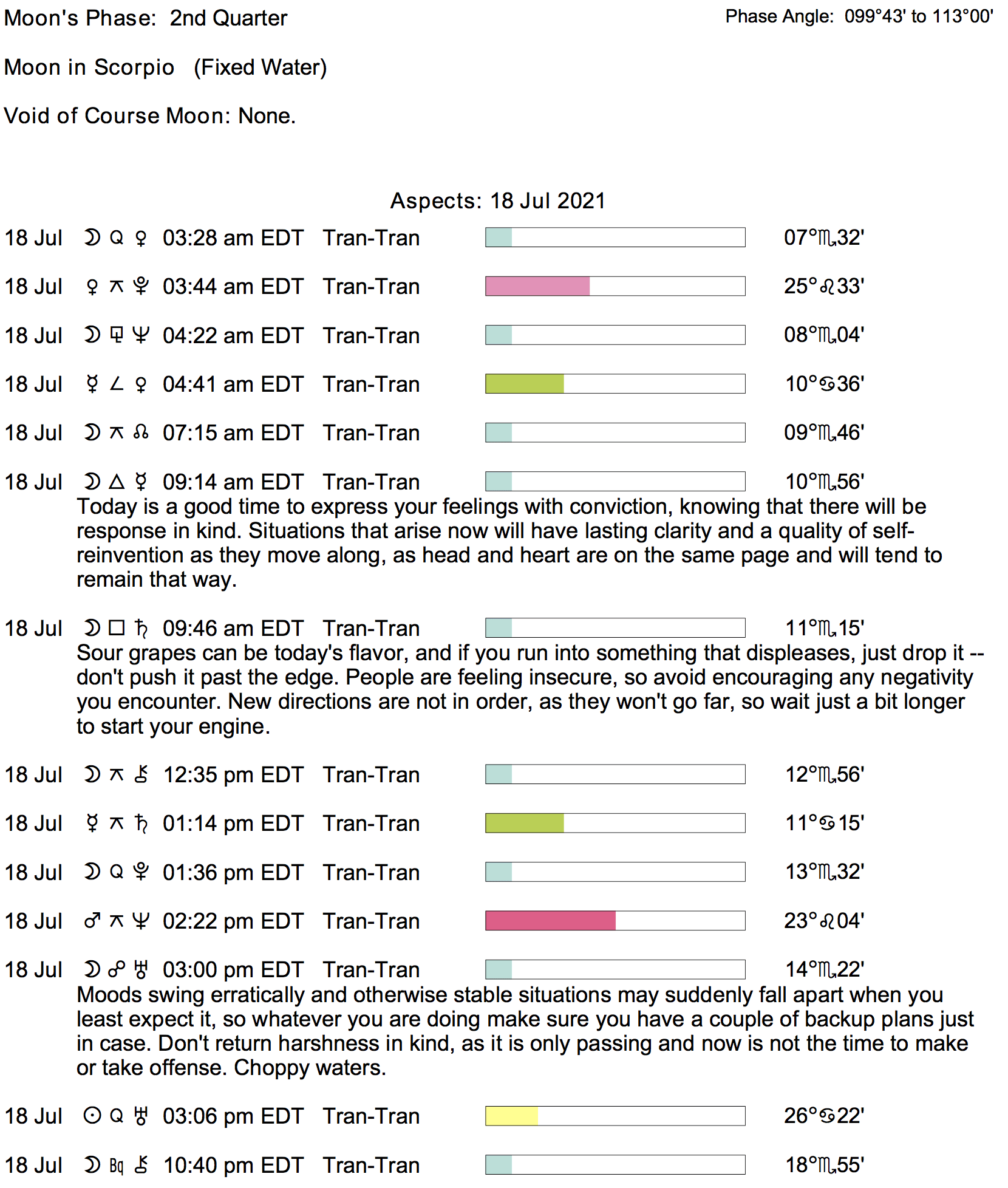 Planet Color Key: The longer the bar, the slower the aspecting planet, and the longer the duration of the planet’s transit.