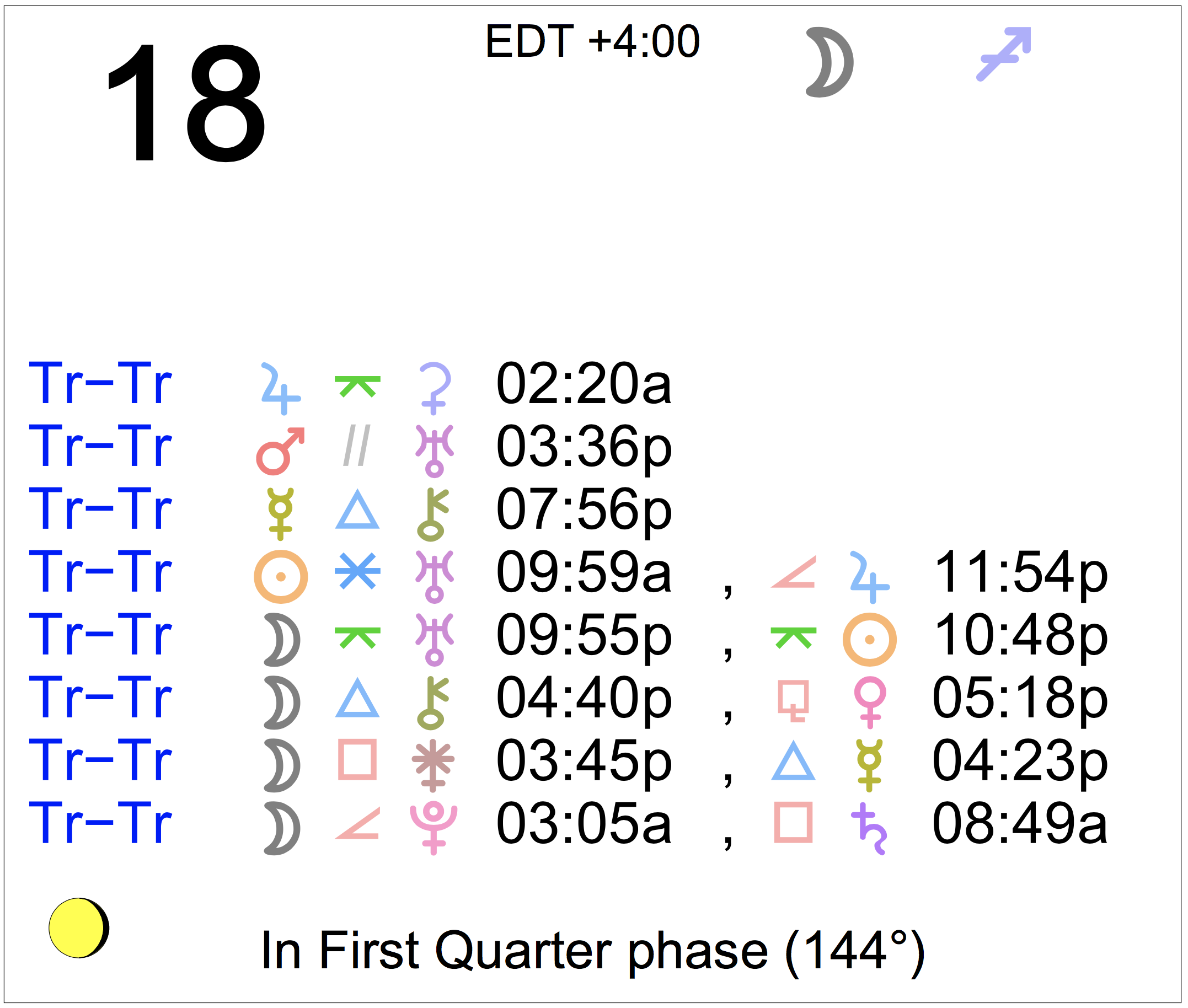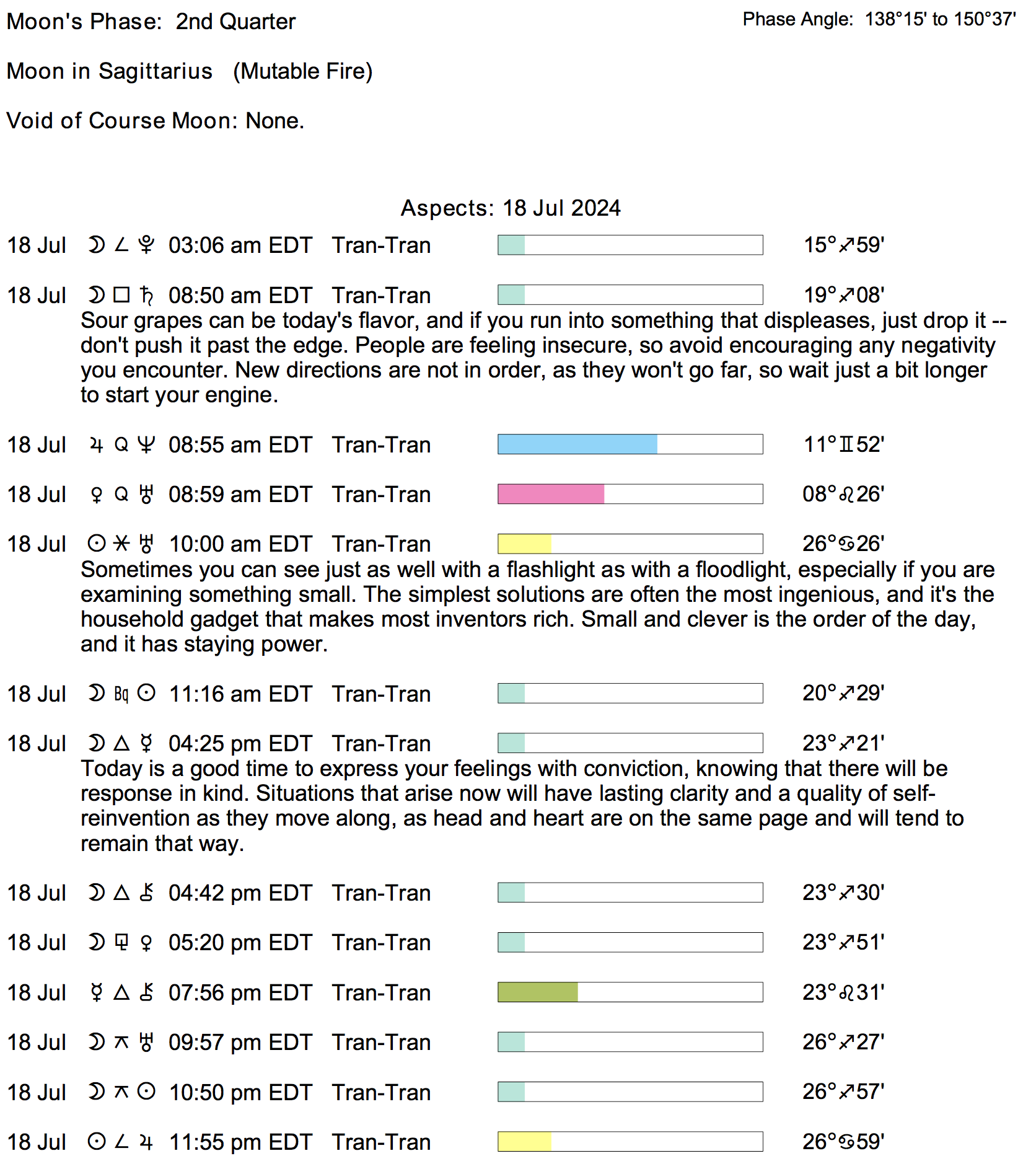 Planet Color Key: The longer the bar, the slower the aspecting planet, and the longer the duration of the planet’s transit.