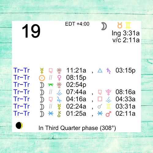The following aspects (major only) and positions are at noon (EDT) on July 19th: