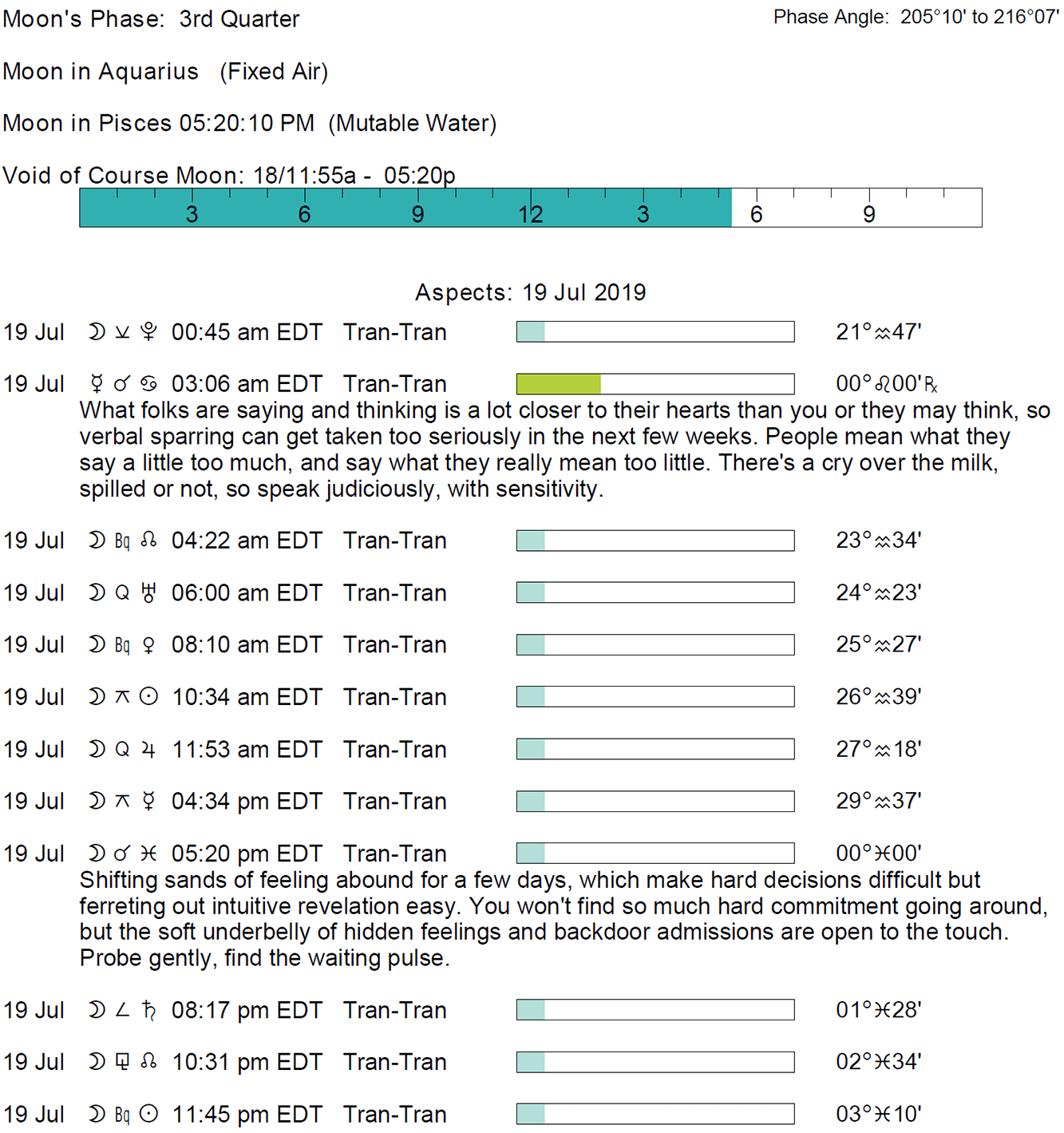 Planet Color Key: The longer the bar, the slower the aspecting planet and the longer the duration of the planet’s transit.