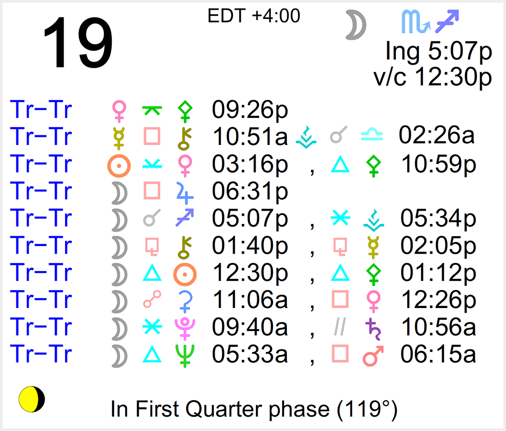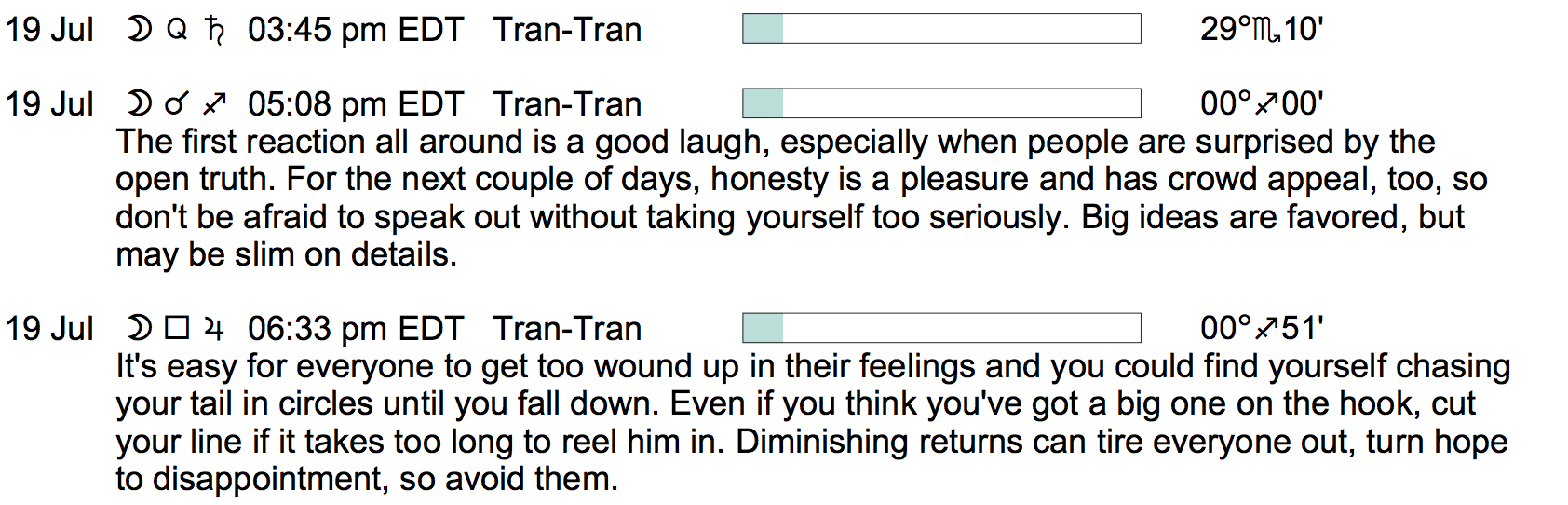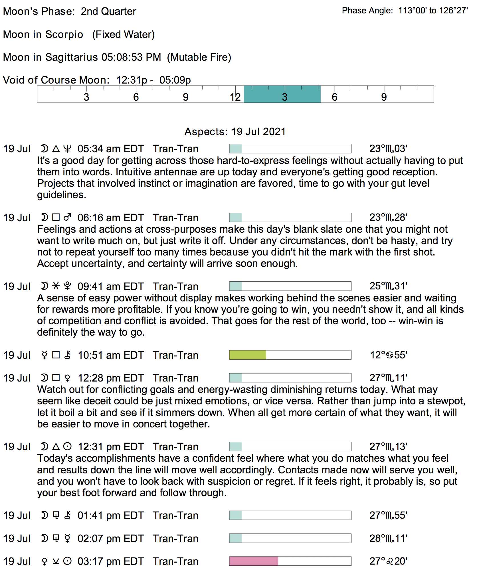 Planet Color Key: The longer the bar, the slower the aspecting planet, and the longer the duration of the planet’s transit.