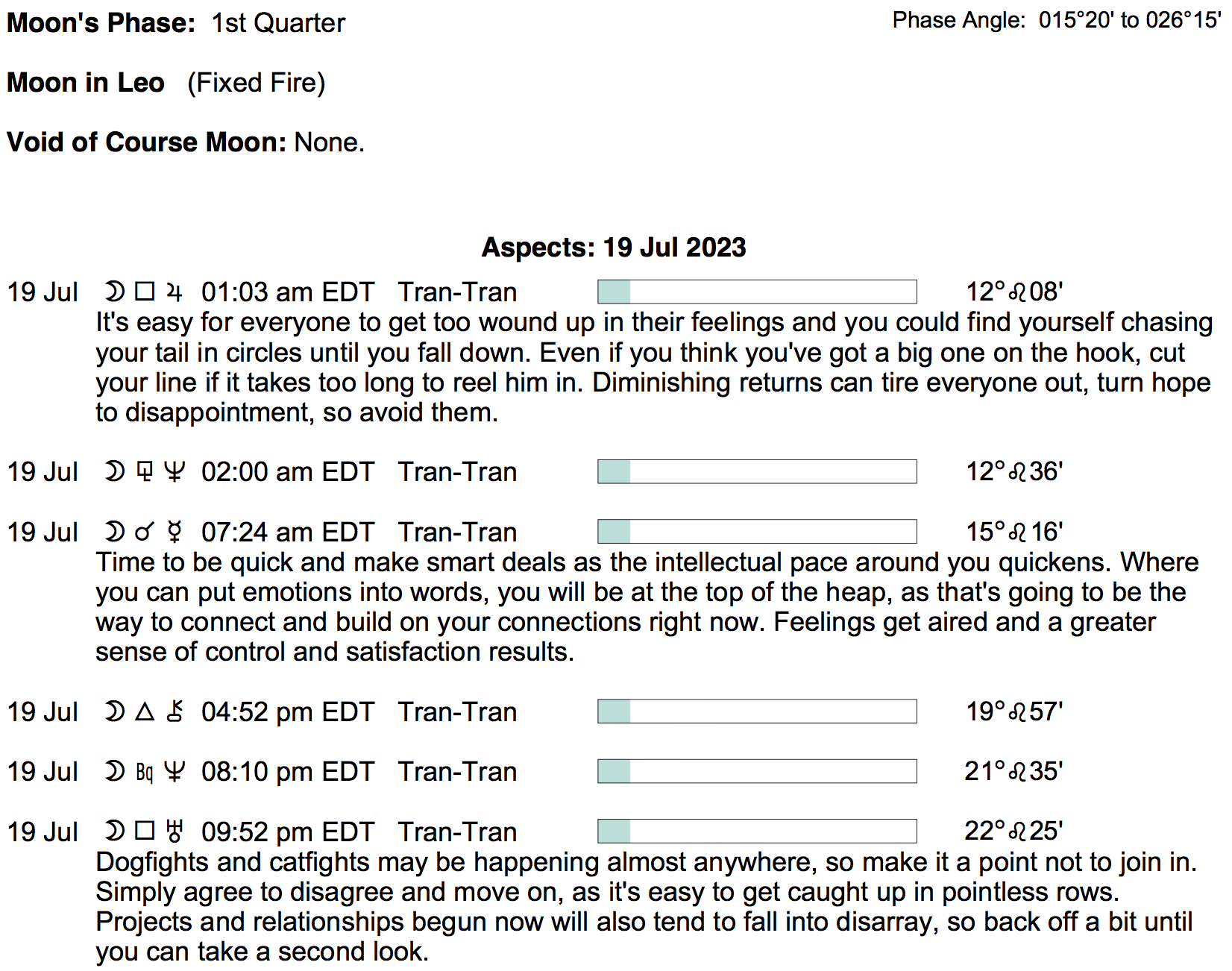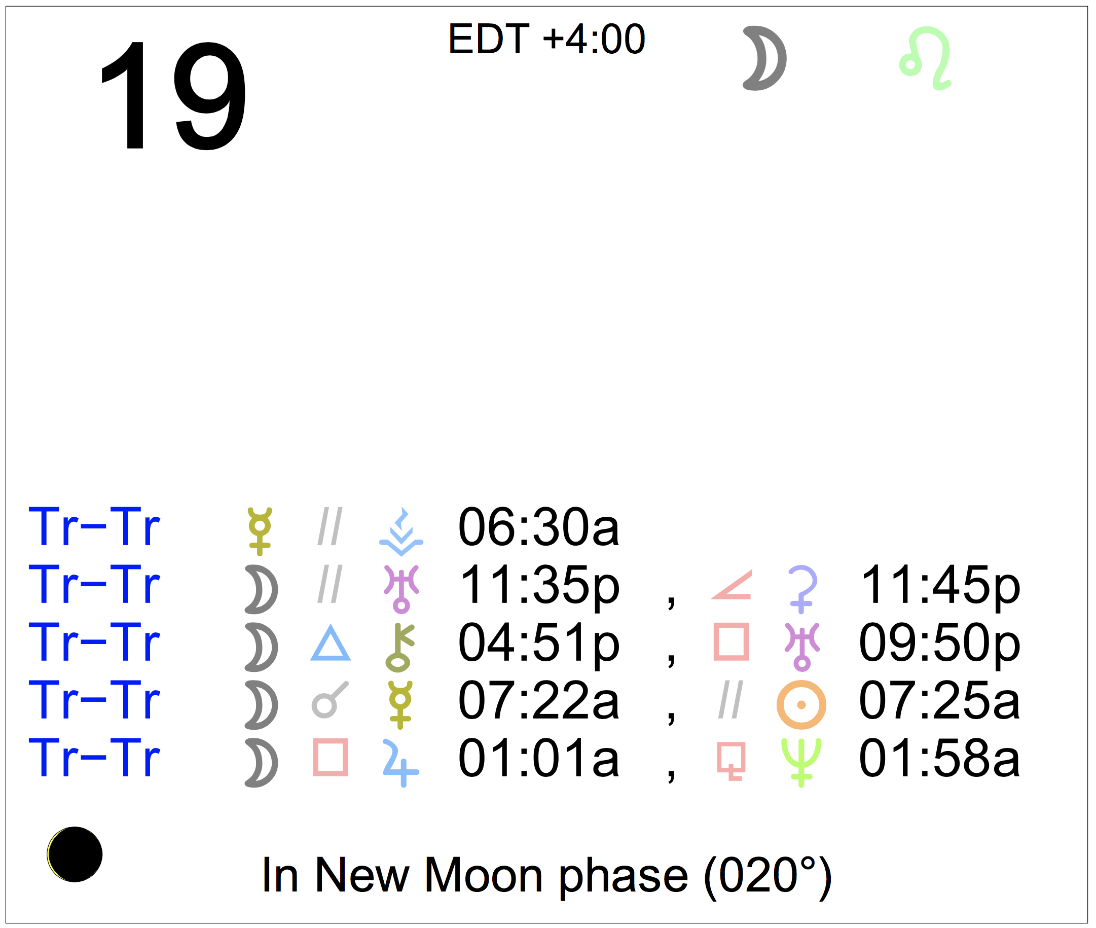 Planet Color Key: The longer the bar, the slower the aspecting planet, and the longer the duration of the planet’s transit.