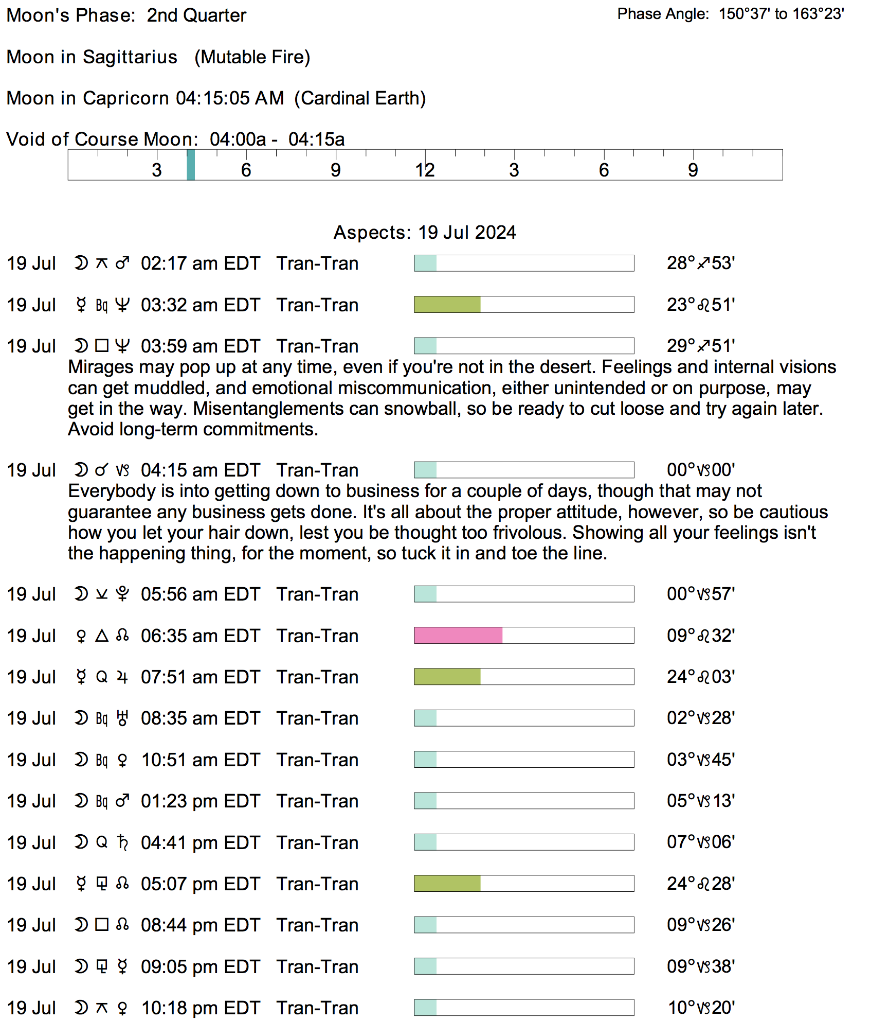Planet Color Key: The longer the bar, the slower the aspecting planet, and the longer the duration of the planet’s transit.