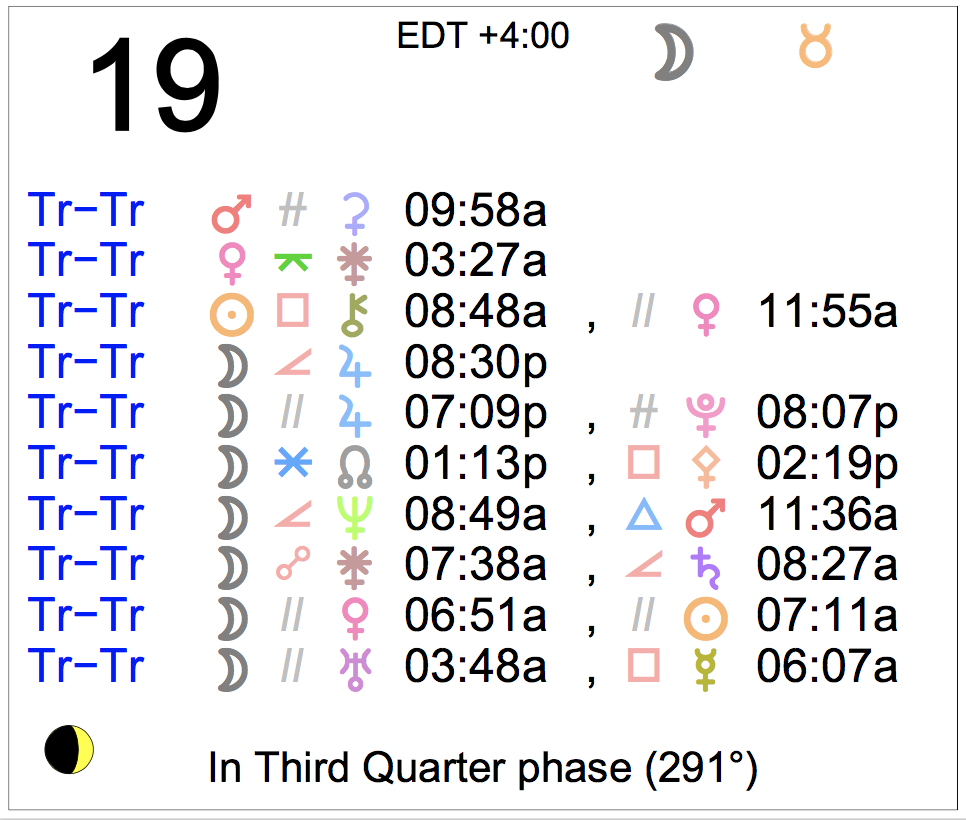 Planet Color Key: The longer the bar, the slower the aspecting planet, and the longer the duration of the planet’s transit.