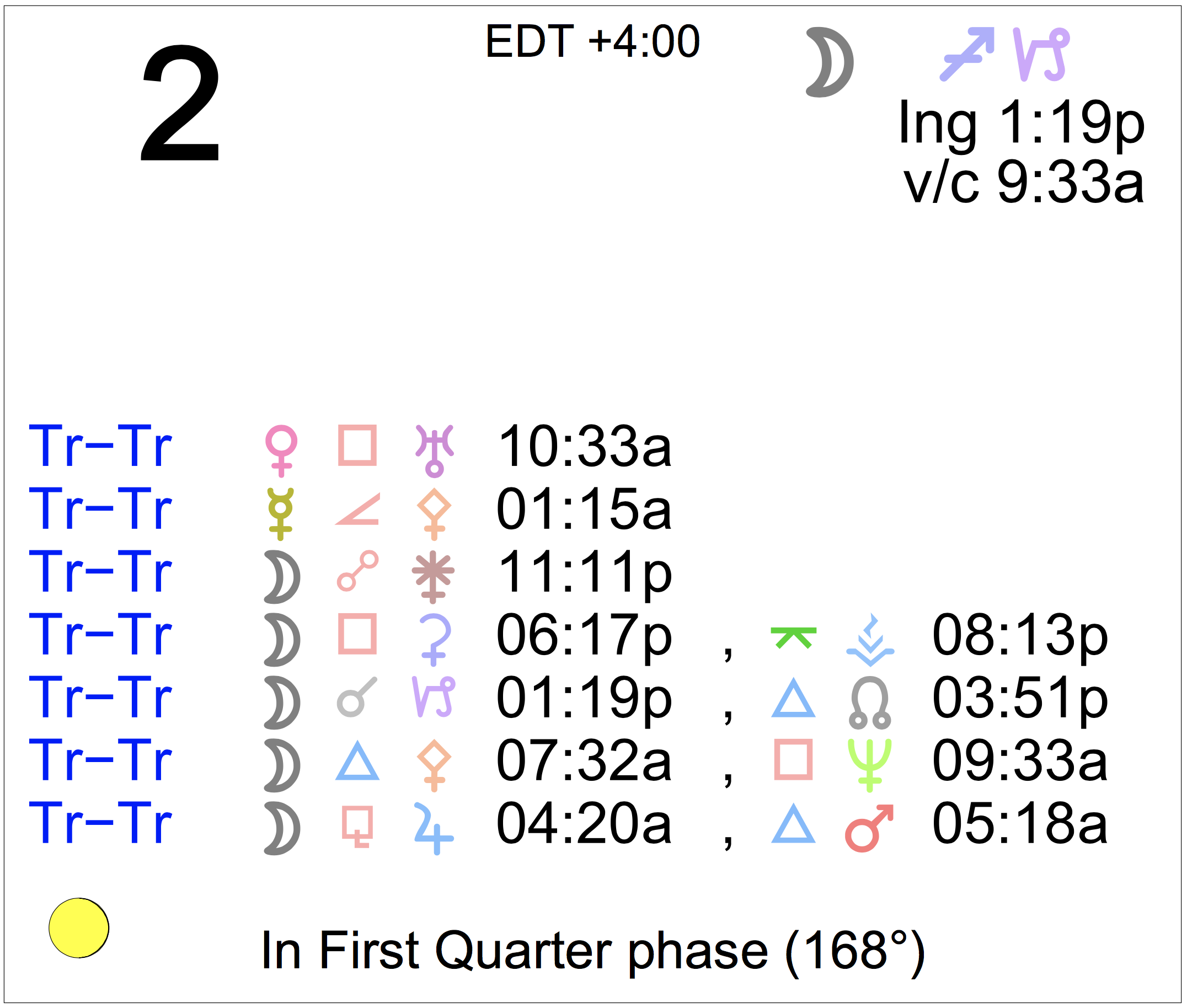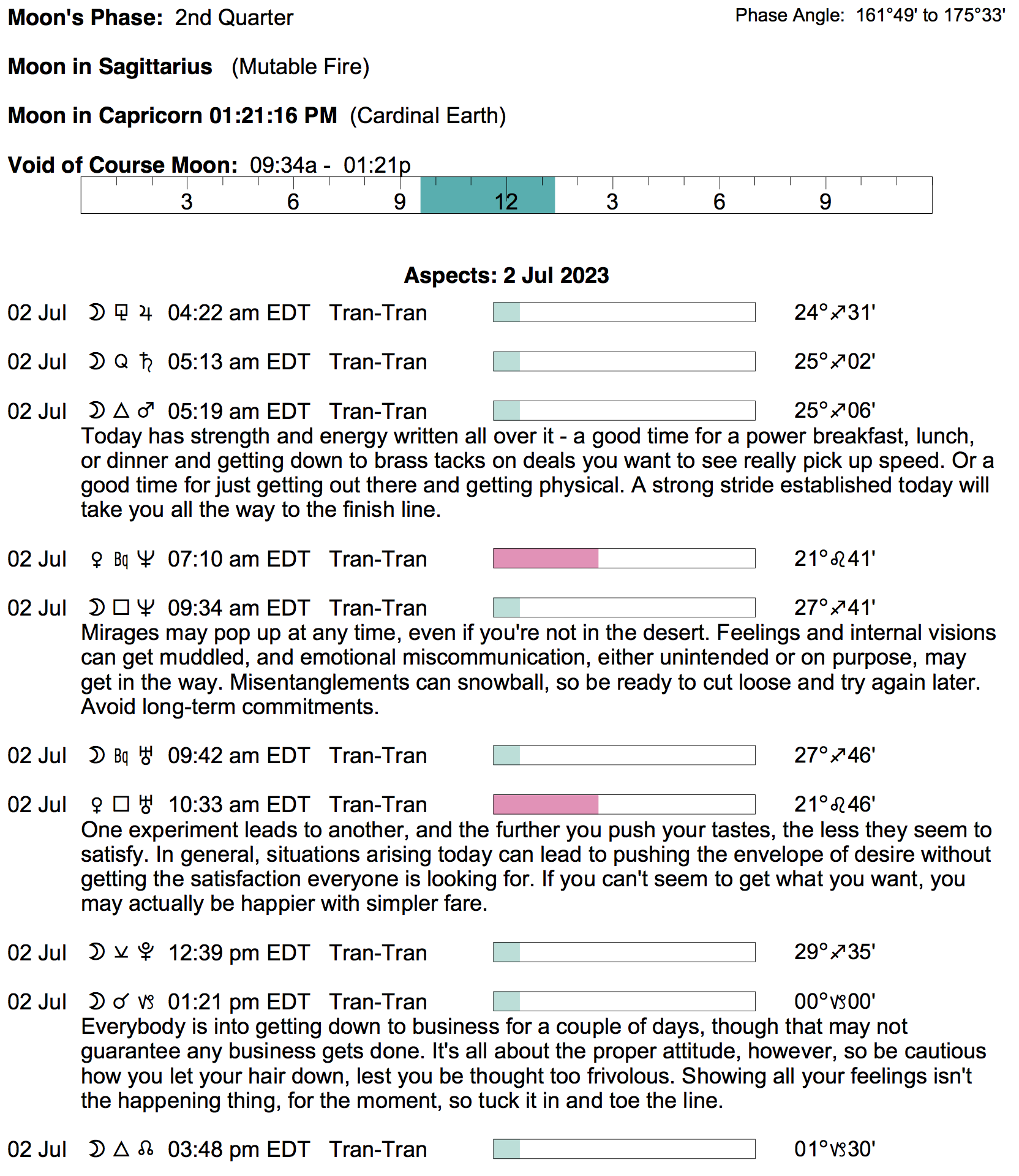Planet Color Key: The longer the bar, the slower the aspecting planet, and the longer the duration of the planet’s transit.