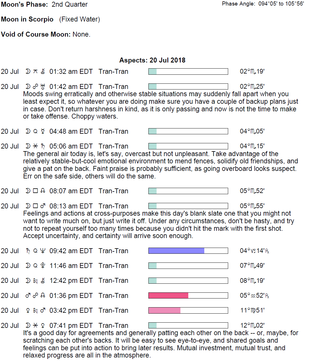 Planet Color Key: The longer the bar, the slower the aspecting planet and the longer the duration of the planet’s transit.