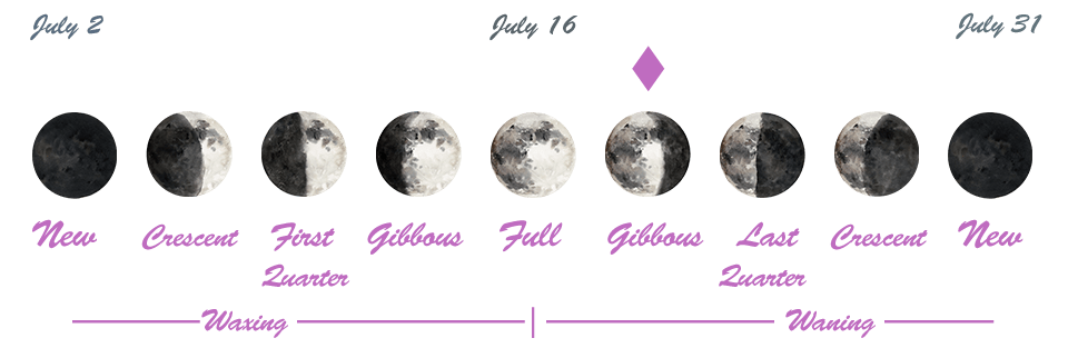 - The Full Moon (a Lunar Eclipse) occurred on the 16th in the sign of Capricorn. The Last Quarter Moon will occur on July 24th.