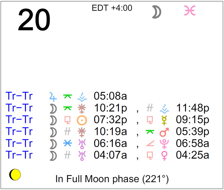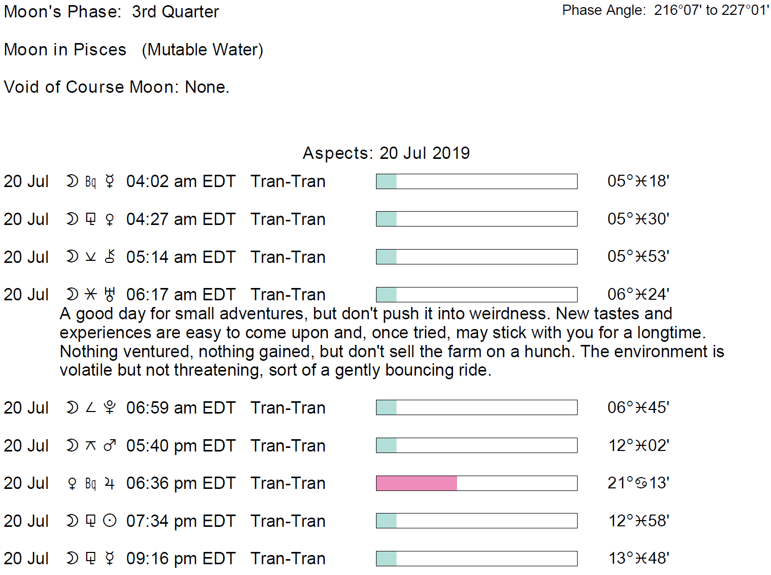 Planet Color Key: The longer the bar, the slower the aspecting planet and the longer the duration of the planet’s transit.