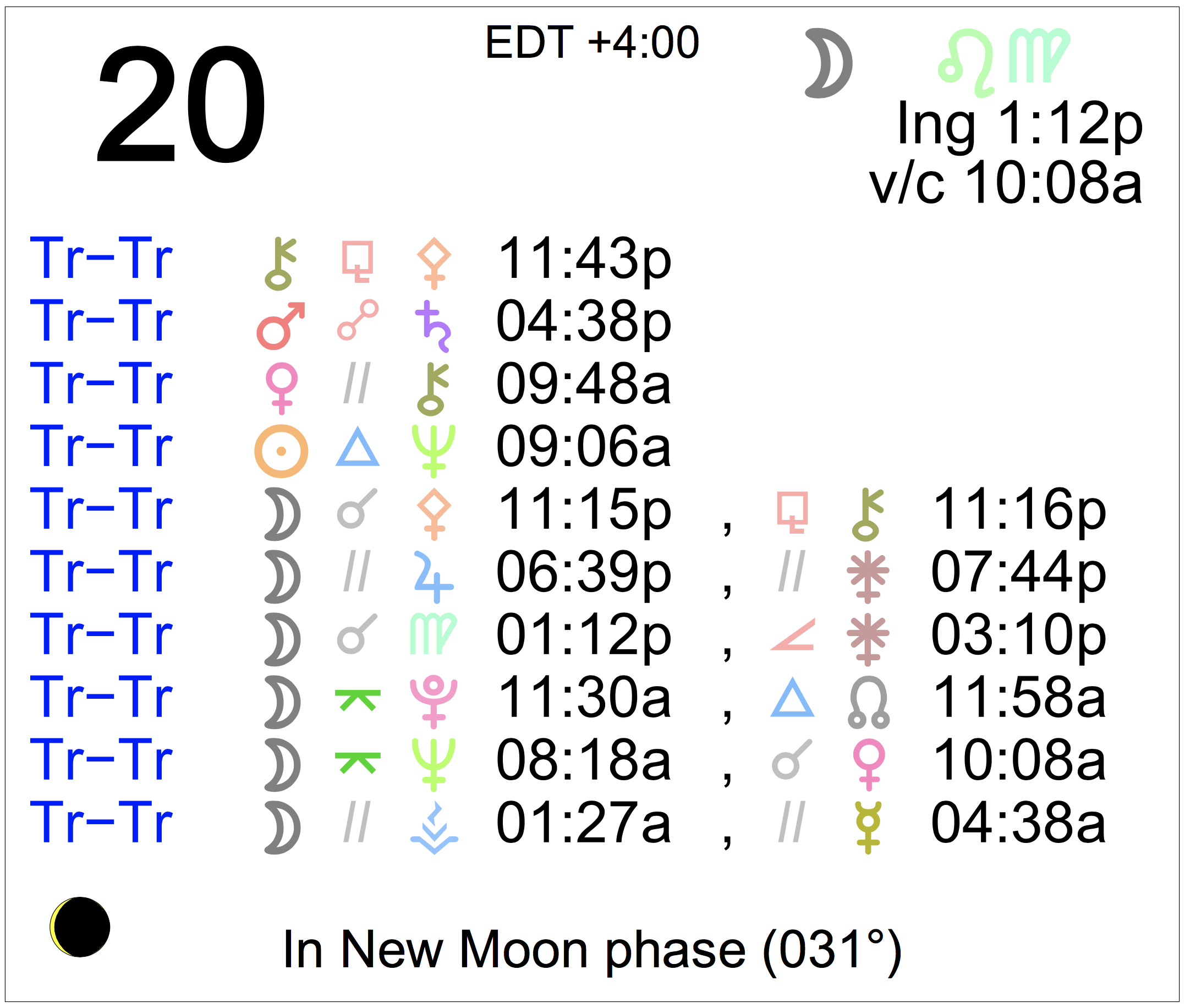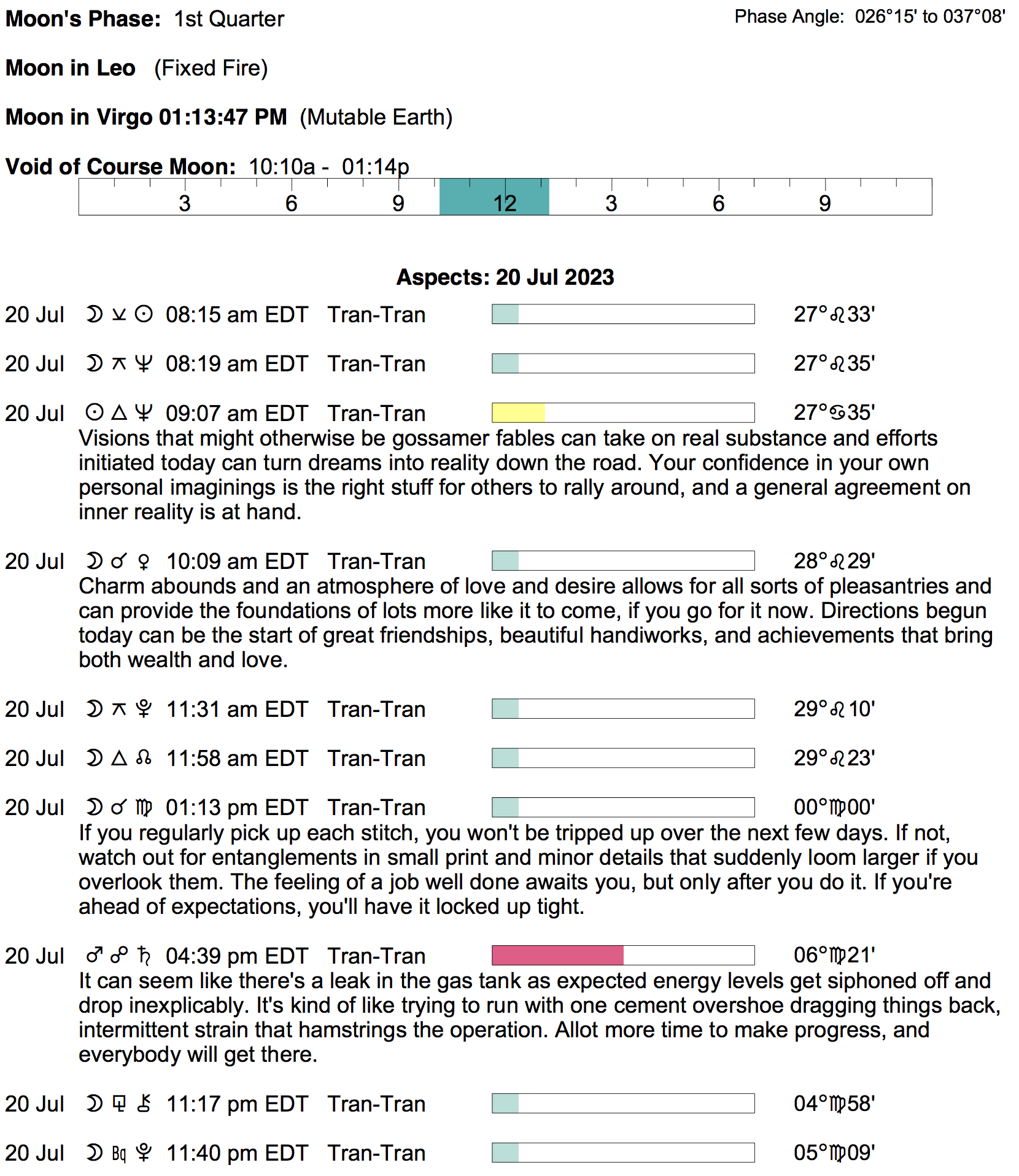 Planet Color Key: The longer the bar, the slower the aspecting planet, and the longer the duration of the planet’s transit.