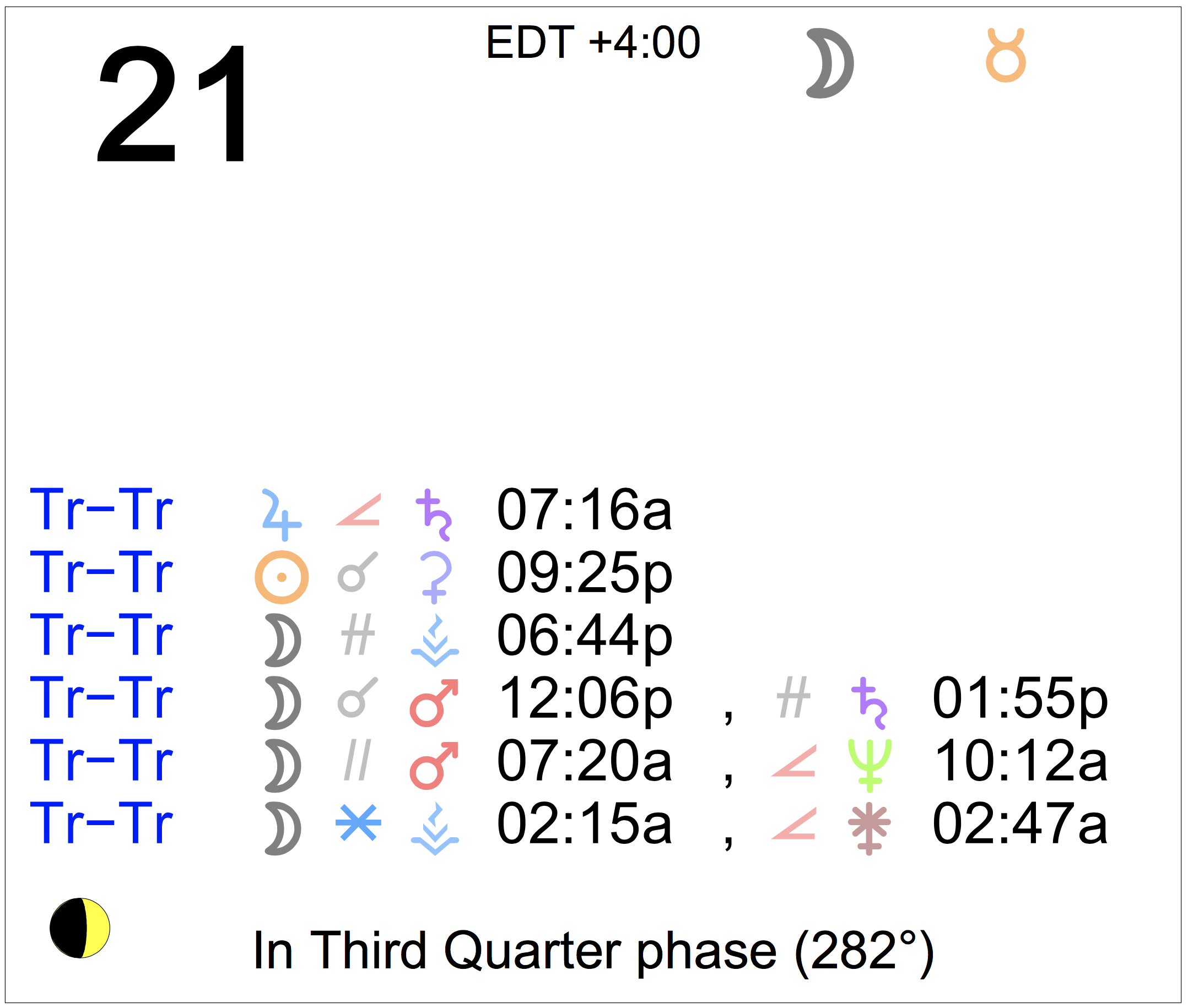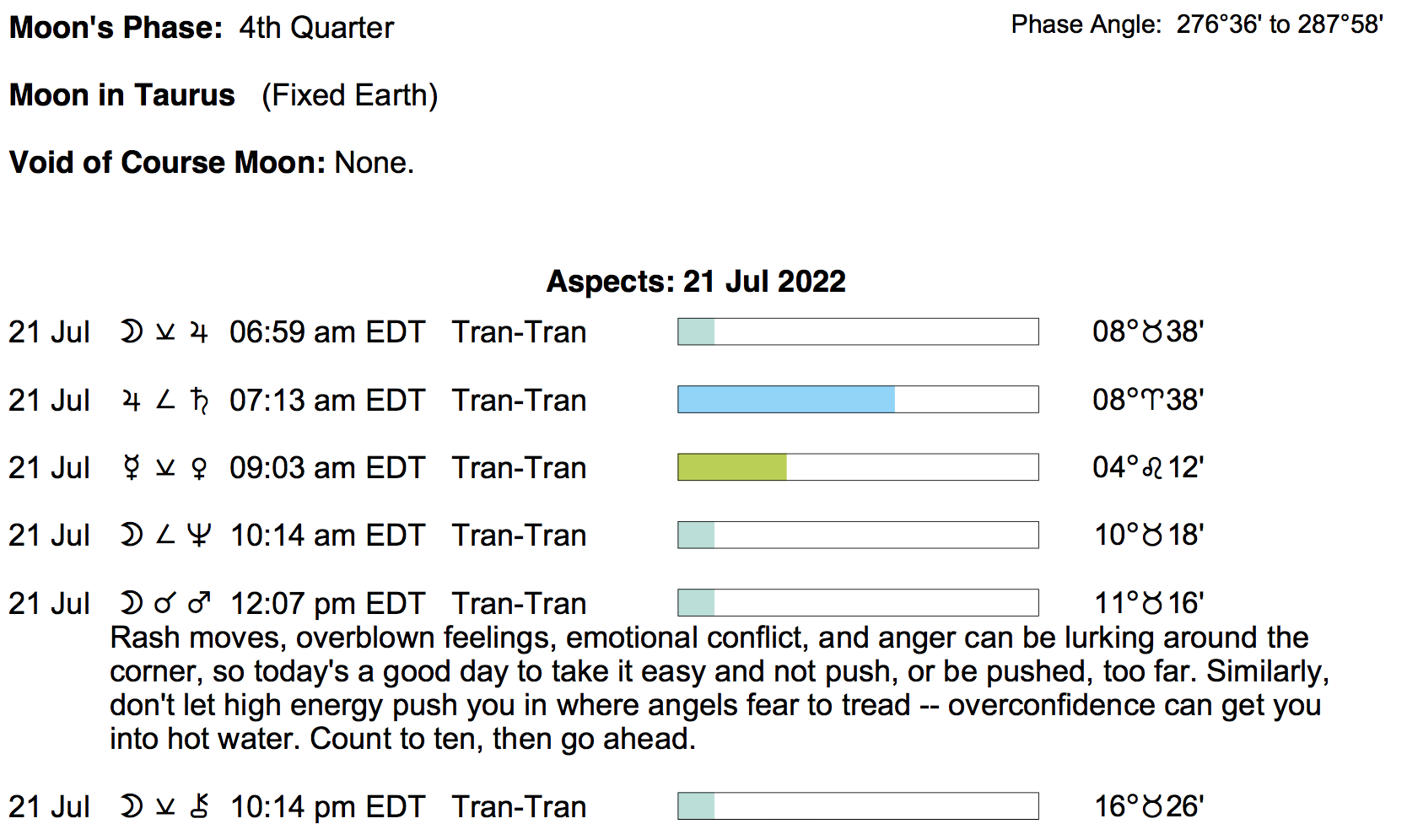 Planet Color Key: The longer the bar, the slower the aspecting planet, and the longer the duration of the planet’s transit.