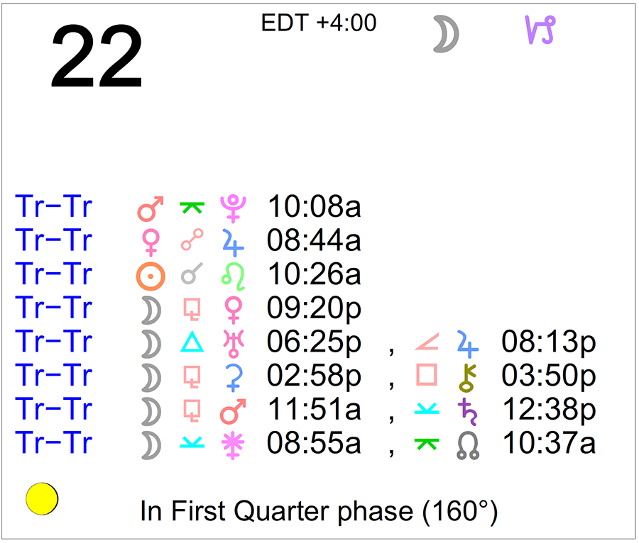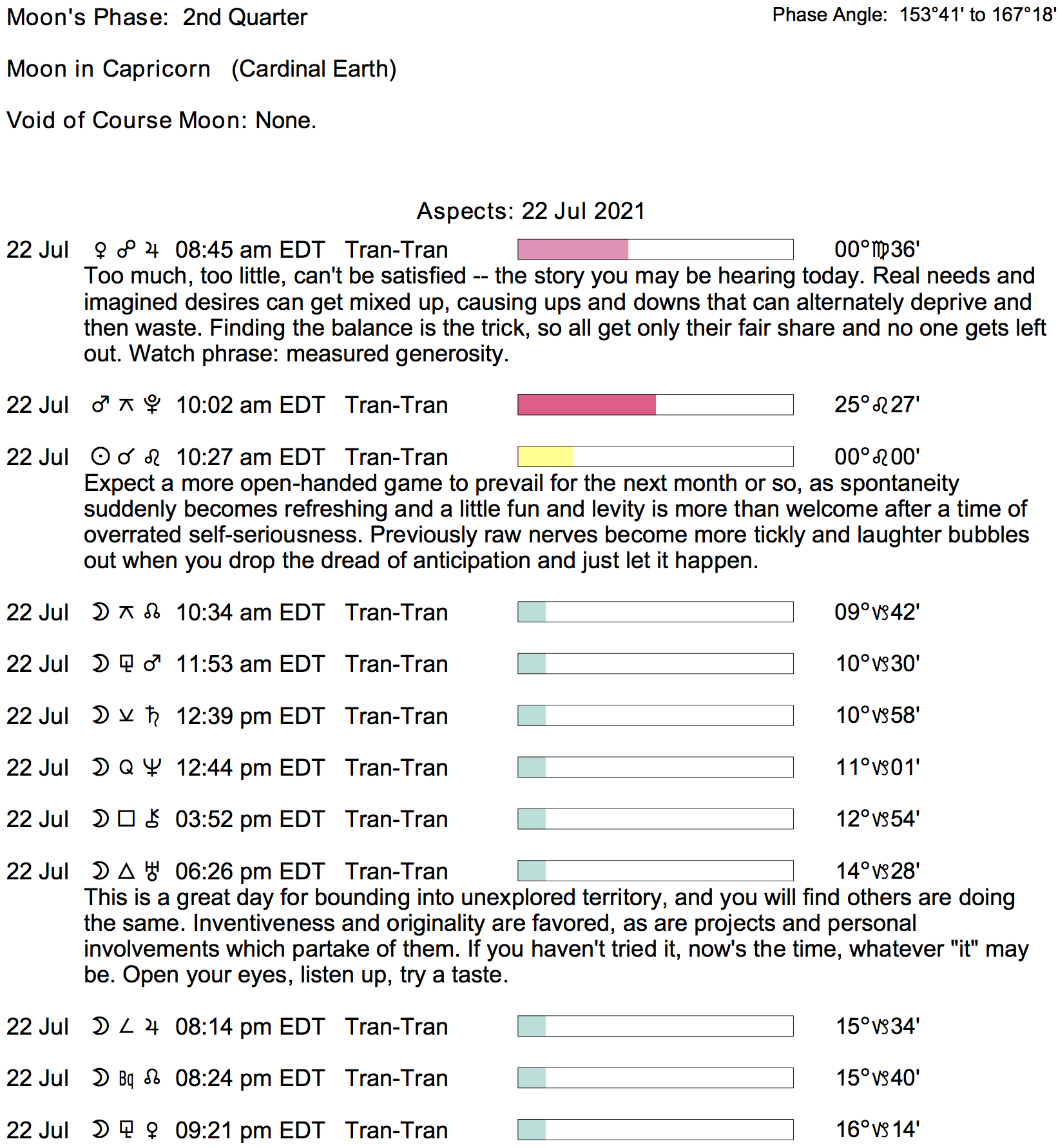 Planet Color Key: The longer the bar, the slower the aspecting planet, and the longer the duration of the planet’s transit.