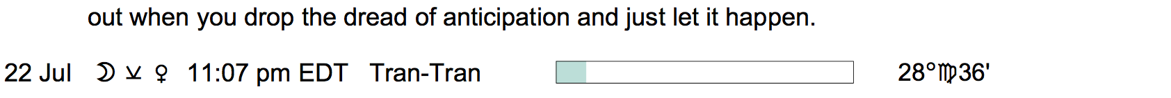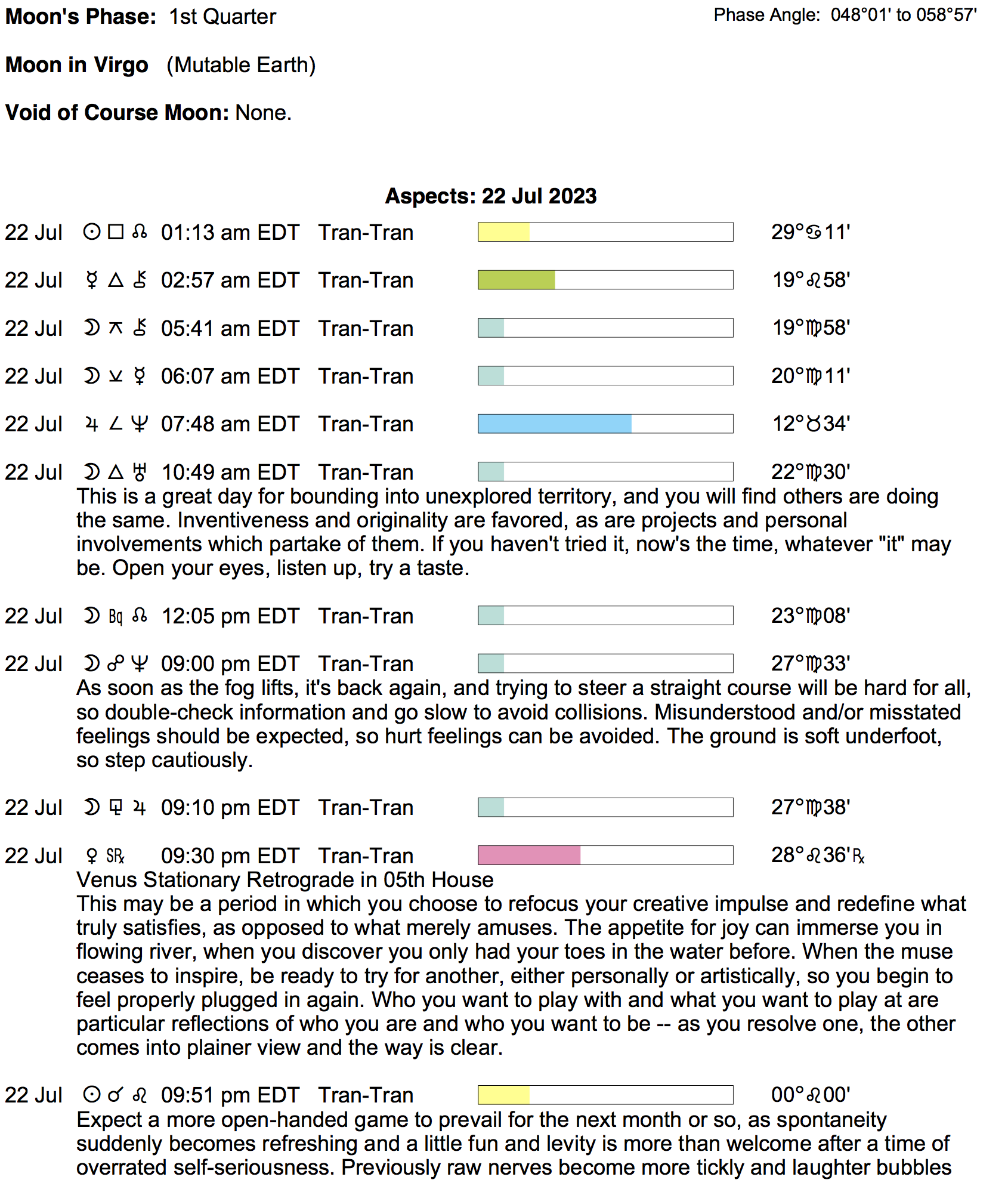 Planet Color Key: The longer the bar, the slower the aspecting planet, and the longer the duration of the planet’s transit.