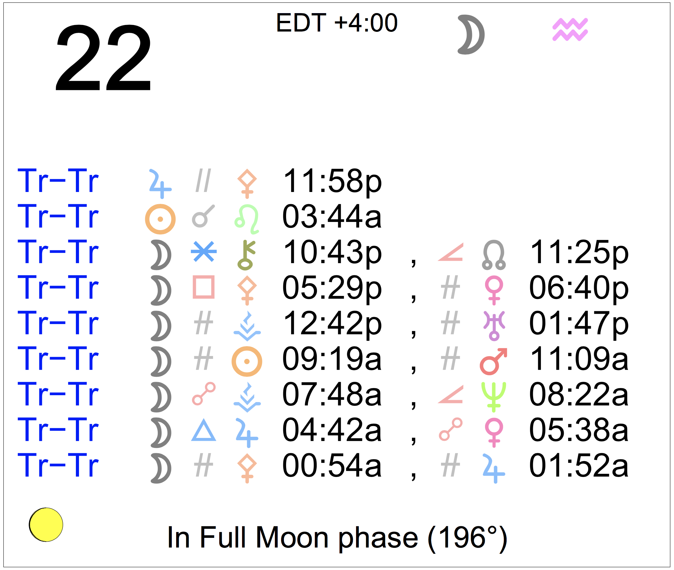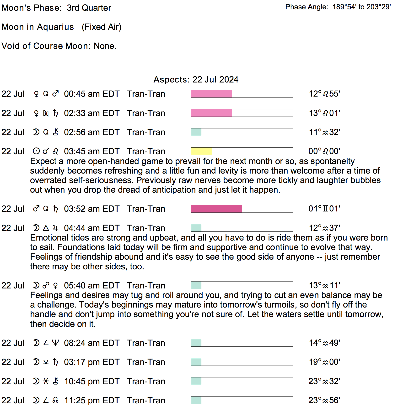 Planet Color Key: The longer the bar, the slower the aspecting planet, and the longer the duration of the planet’s transit.